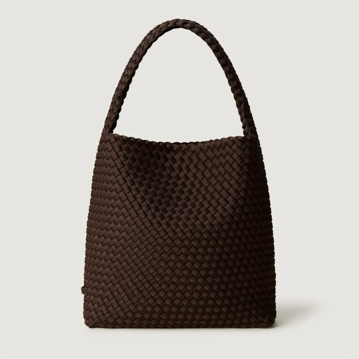 Håndvevd neopren veske fra Naghedi i chocolate. Nomad Hobo er romslig og behagelig å ha på seg hele dagen, med en bred stropp som sitter flatt på skulderen.