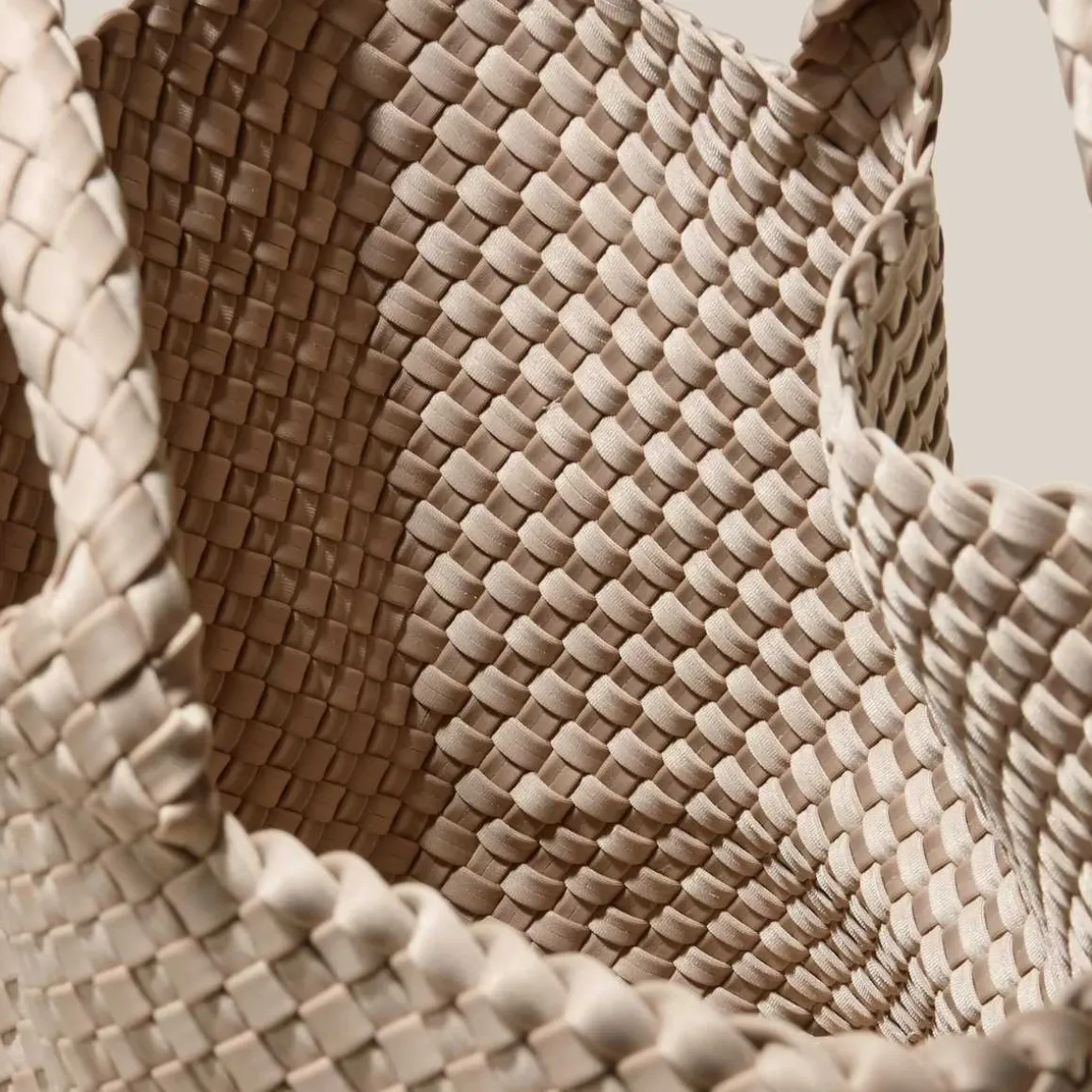 St Barths Tote Bag i medium fra Naghedi. Håndvevd neopren i beige. Barths Medium Tote er en allsidig hverdagsveske for jobb, strand eller reise.
