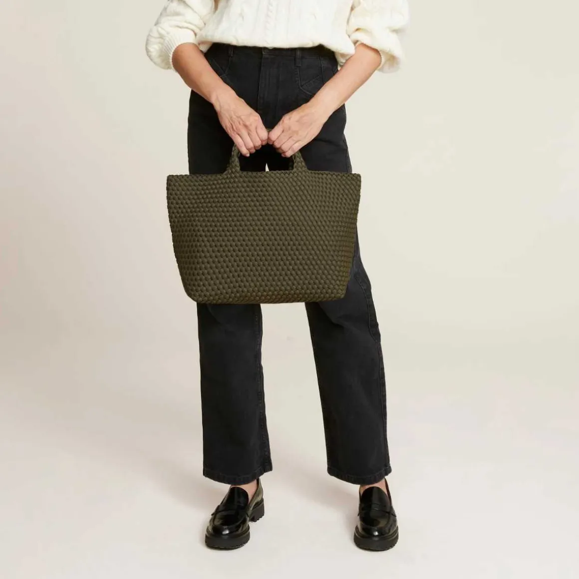 St Barths Tote Bag i medium fra Naghedi. Håndvevd neopren i grønn. Barths Medium Tote er en allsidig hverdagsveske for jobb, strand eller reise.