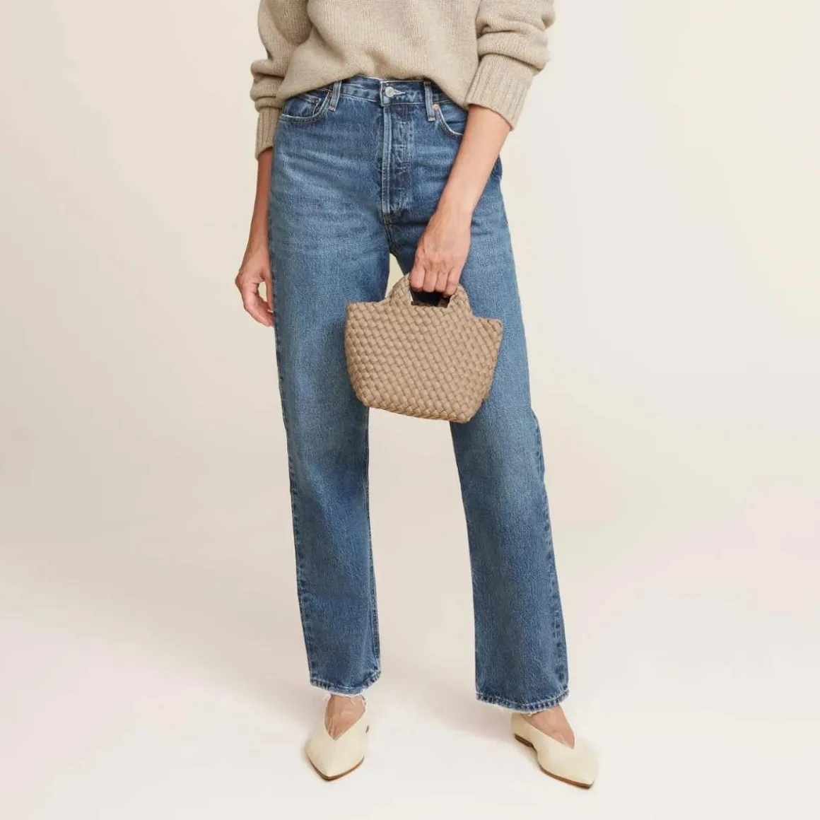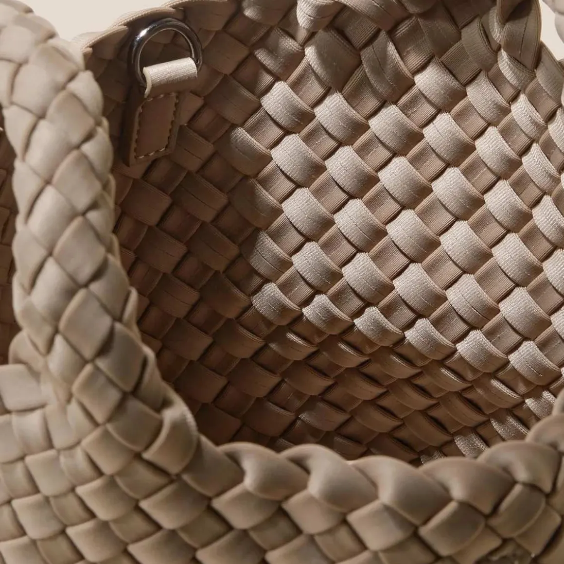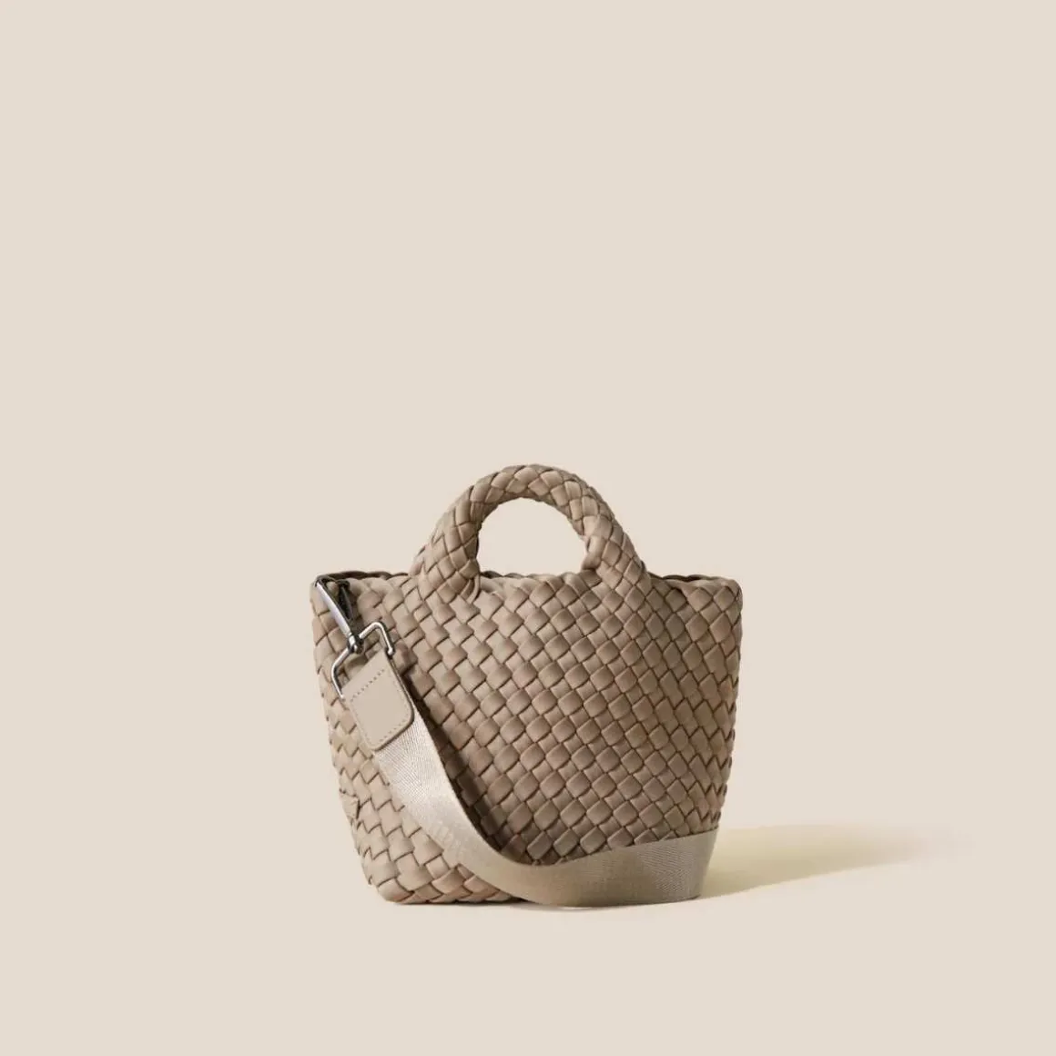Naghedi St. Barths Petit. Håndvevd neopren i brunt. Barths Petit Tote går sømløst over fra dagtid til kveldstid, og bærer alle de viktigste tingene dine på en komfortabel måte.