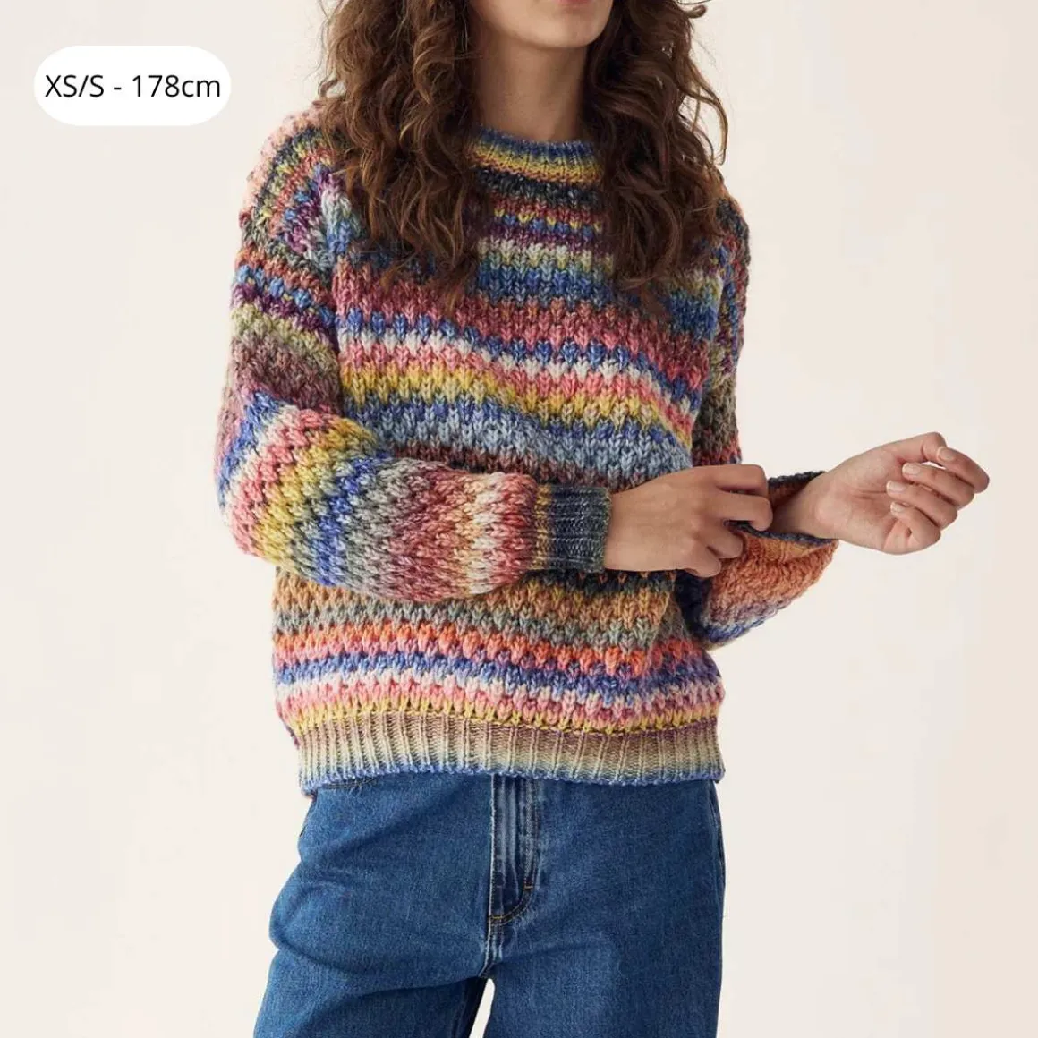 Gio Knit Sweater er en løs genser laget av 53 ull. Hvert plagg er unikt på grunn av garnets fargeprosess, noe som kan gi små variasjoner mellom produktene. Den har ballongermer.