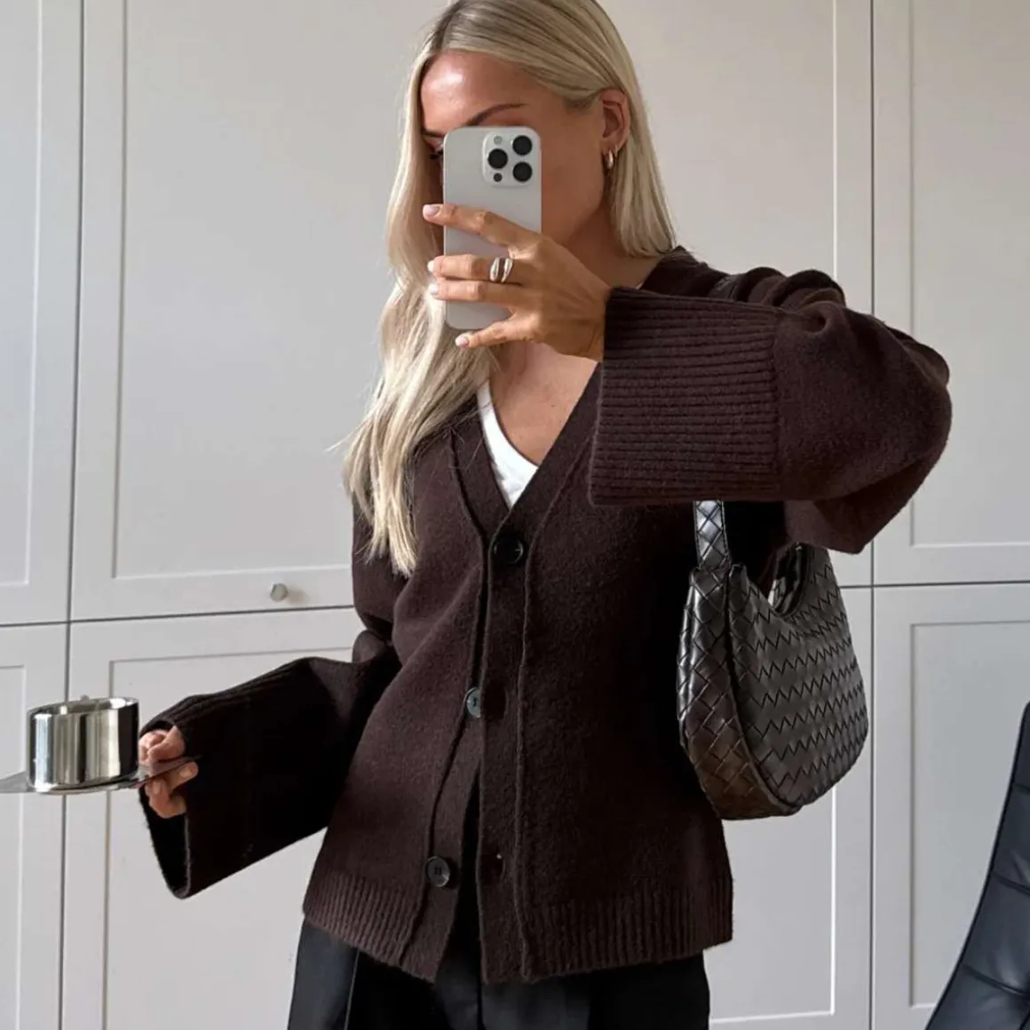 Lenyx Cardigan er en kort cardigan med en tettsittende passform, voluminøse ermer og store knapper.