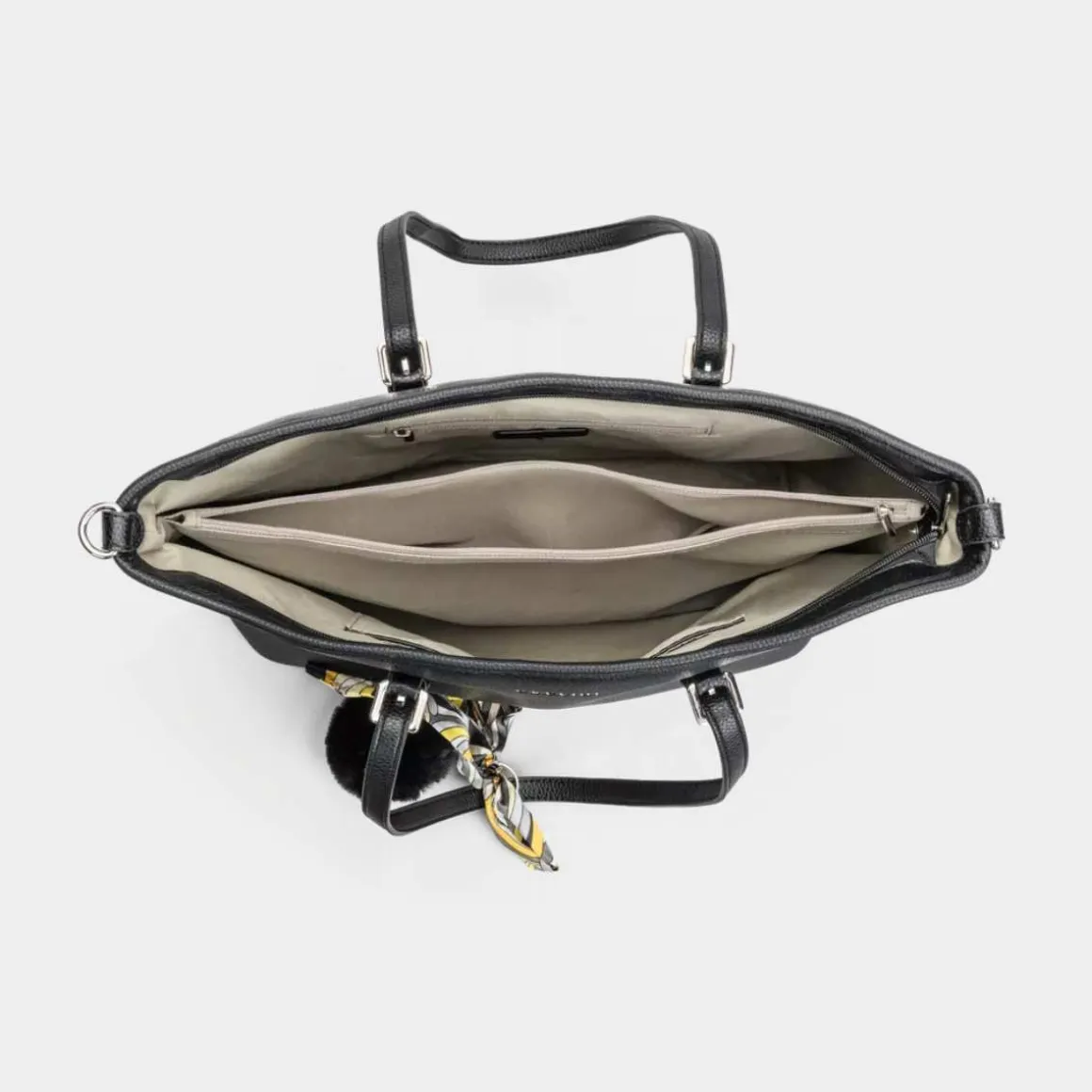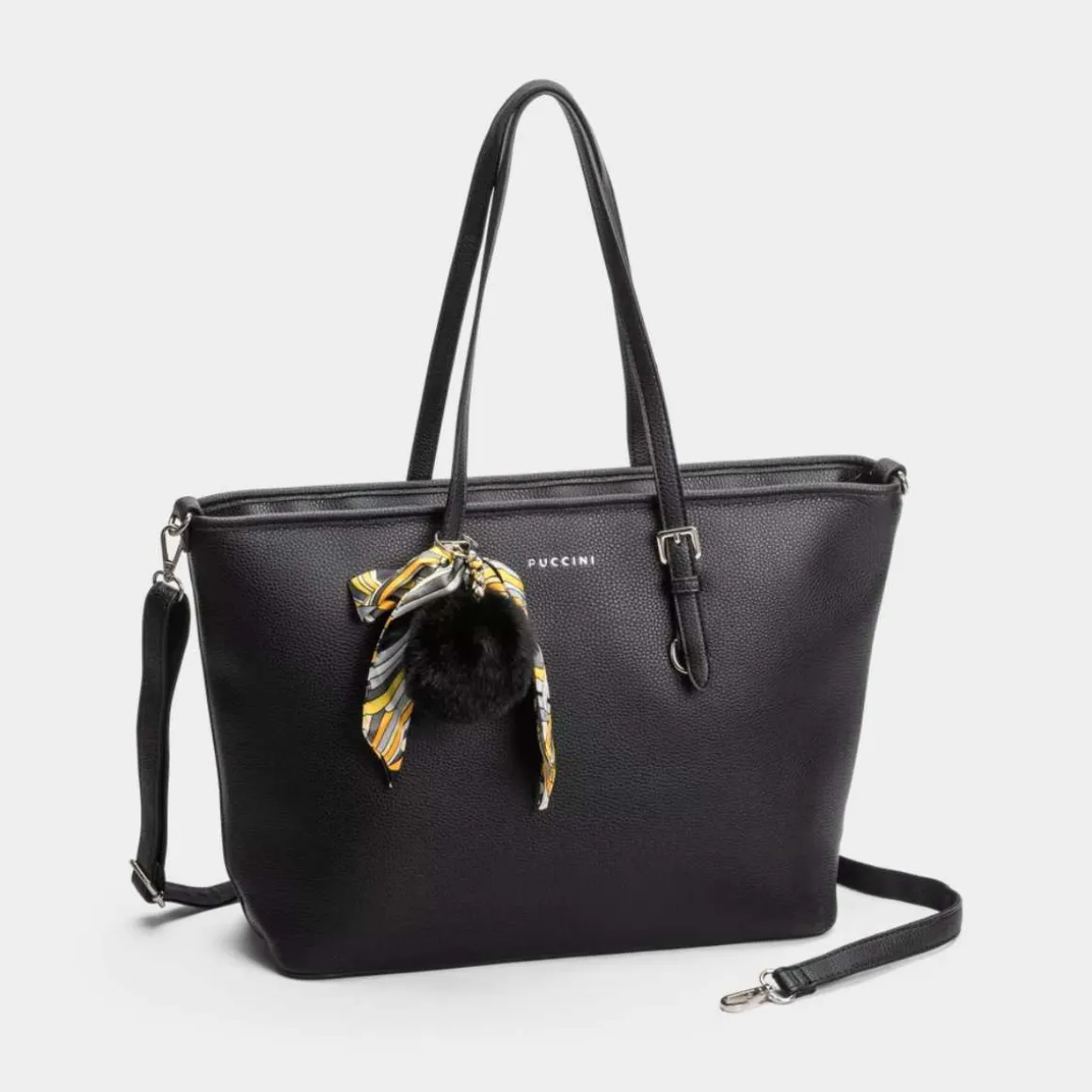 Klassisk sort veske fra Puccini, laget av nydelig imitert skinn. Vesken er designet med en stabil bunn utrustet med metallføtter, noe som gjør det enkelt å plassere den hvor som helst uten bekymringer. Den praktiske toppglidelåsen sikrer dine eiendeler trygt på plass. På innsiden finner du to store åpne rom, to mindre åpne lommer og to glidelåslommer, perfekt for organisering av dine nødvendigheter.