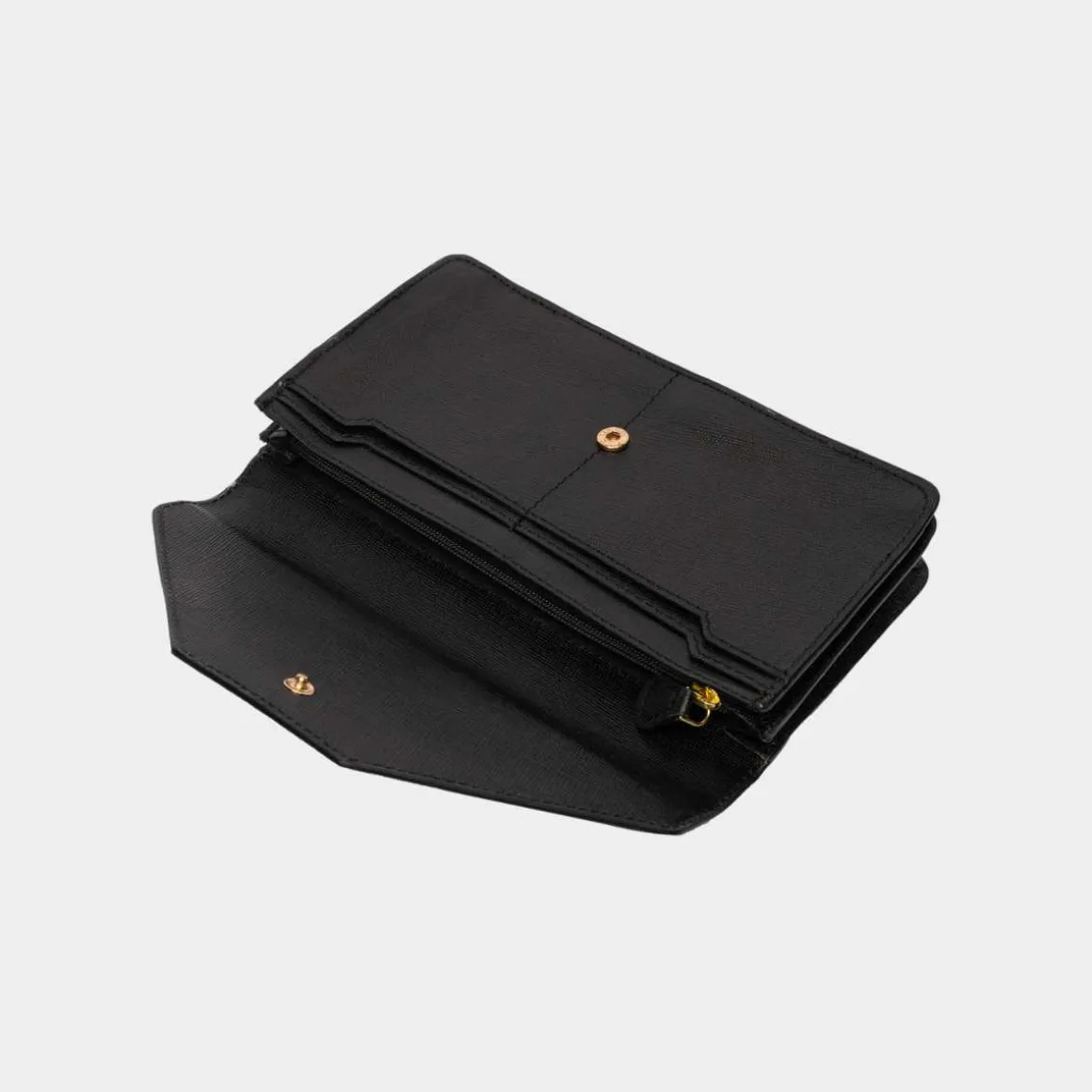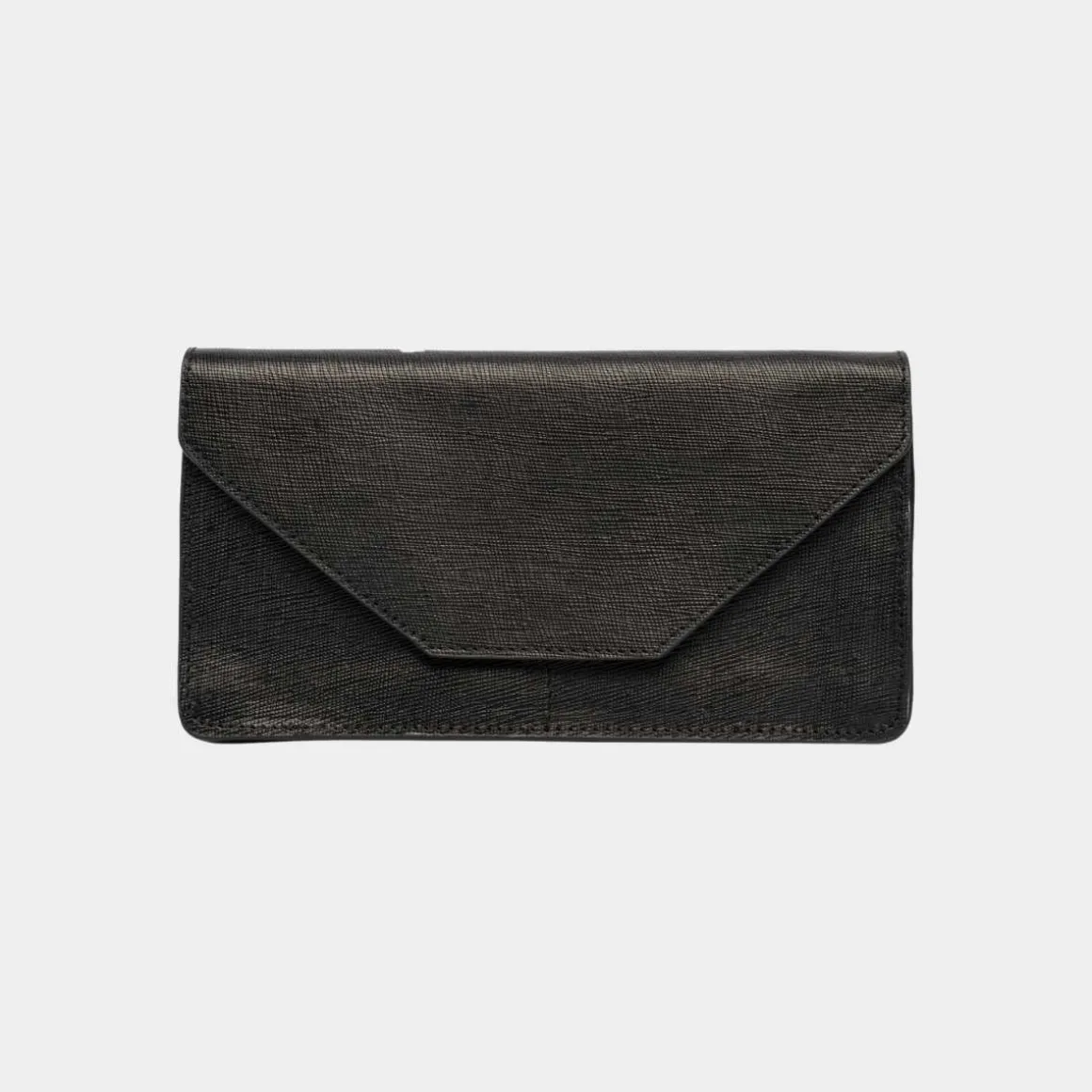 ReDesigned by Dixie, Elvira Wallet i svart. Elvira-lommeboken er laget av det eksklusive Saffiano-læret. Den har to hovedrom, adskilt av et glidelåsrom. På forsiden er det fire lommer for kredittkort. På baksiden er det en liten glidelåslomme. Lommeboken lukkes med en sterk trykknapp. Den er romslig nok til å passe en telefon.