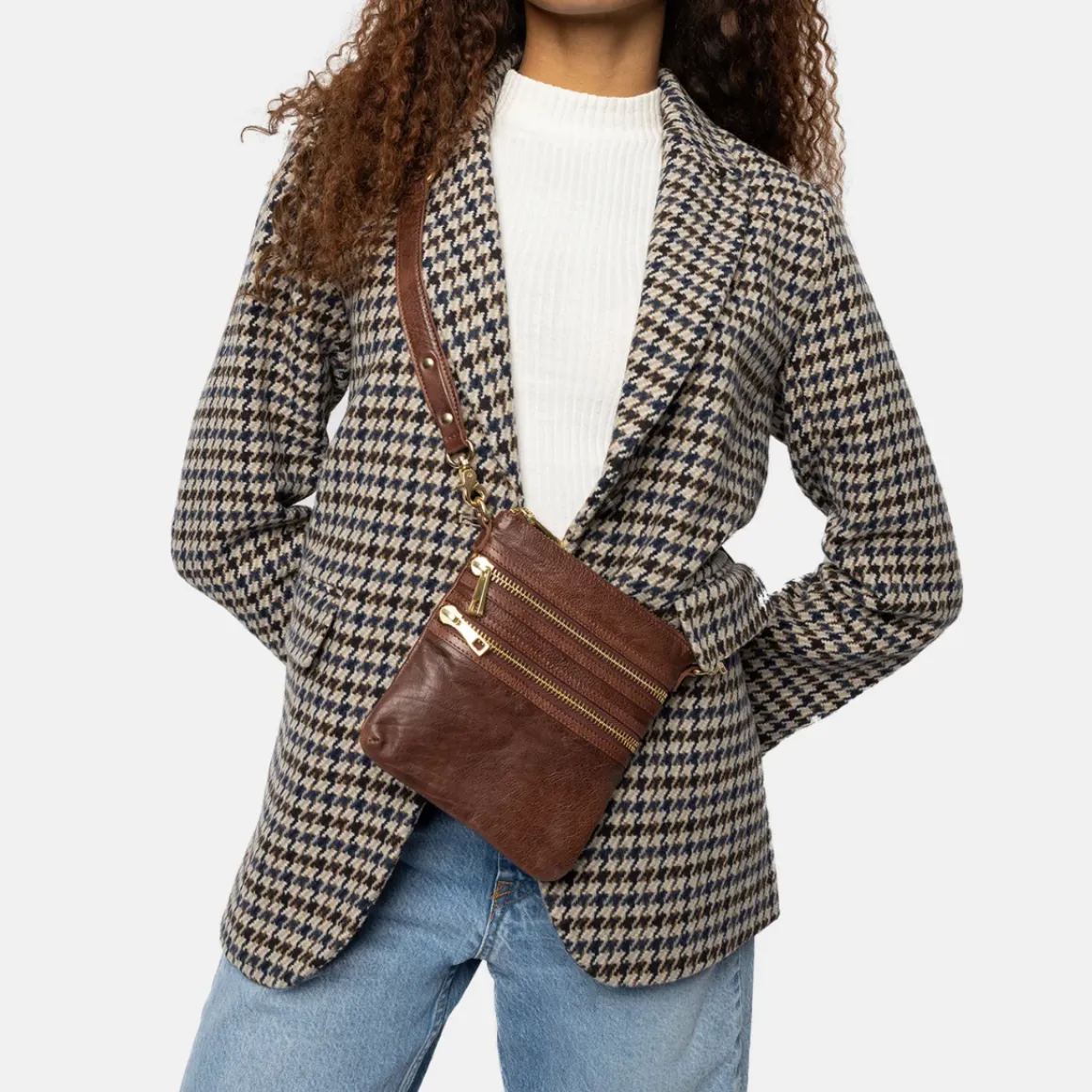Emilia Small er en crossover-veske laget av Redesigned sitt myke vintageskinn. Det er 1 hovedrom og 2 frontlommer alle lukket med 8 mm metallglidelåser. Innvendig har du 1 glidelåslomme og 1 åpen lomme. Vesken kommer med en crossover stropp som kan justeres og tas av.
