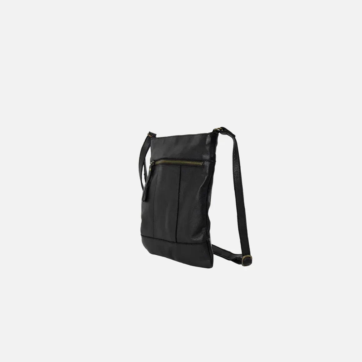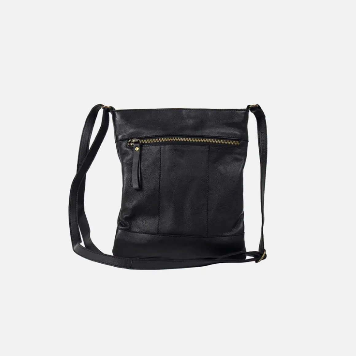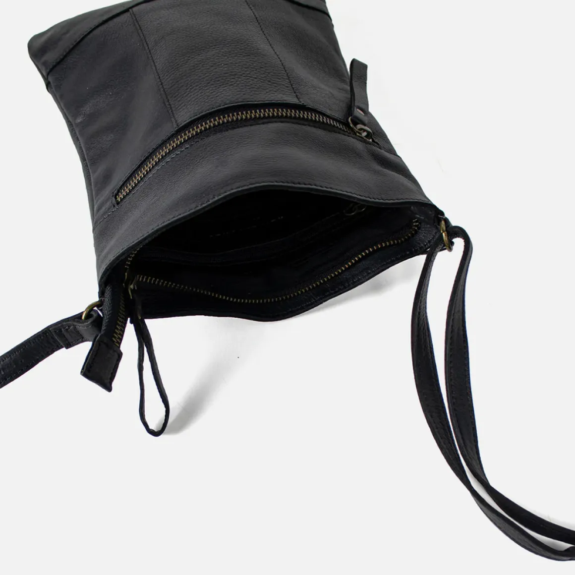 En myk crossover-veske fra Redesigned by Dixie med én frontlomme som lukkes med metallglidelås. Hovedrommet lukkes med metallglidelås og har en liten glidelåslomme i fôret og to åpne lommer som passer til telefonen og nøkler. Den har en justerbar crossover-stropp.