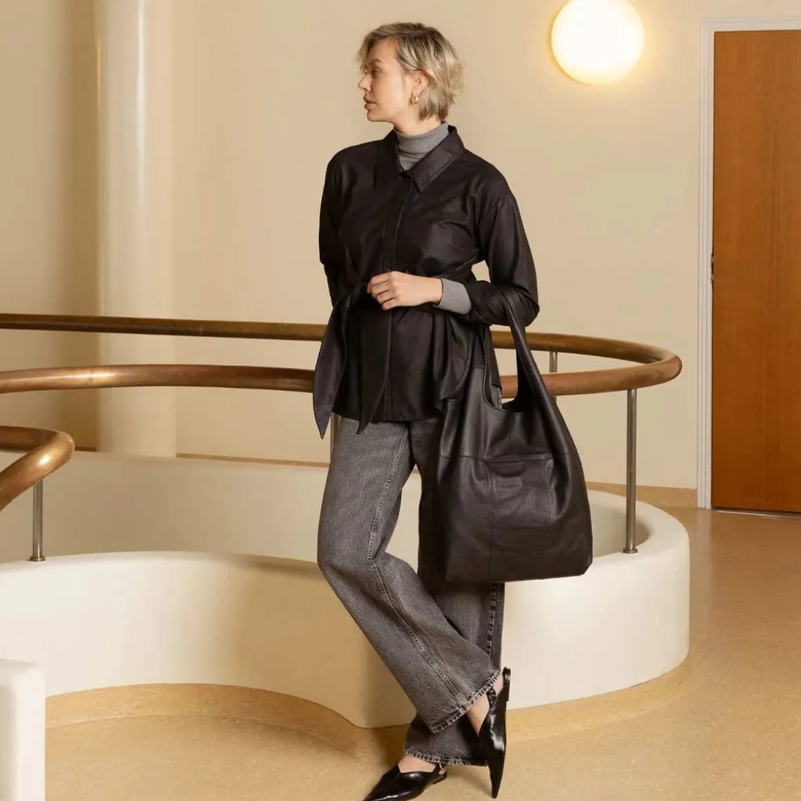 Klassisk tote i lettvektig fullkornslær. Passer til alle daglige behov, med en glidelåslomme, uten foring for et naturlig utseende, og plass til en 15″ laptop.
