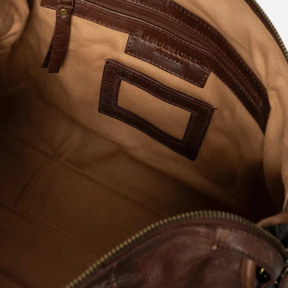 Den er laget i Urban-skinnkvalitet – et naturlig preget kuskinn der hver veske blir bearbeidet og farget før overflaten ferdigstilles, noe som bevarer den originale kornstrukturen i råskinnet. Etter farging påføres et lett vokslag for hånd, som gir en myk og jevn finish med unike detaljer.