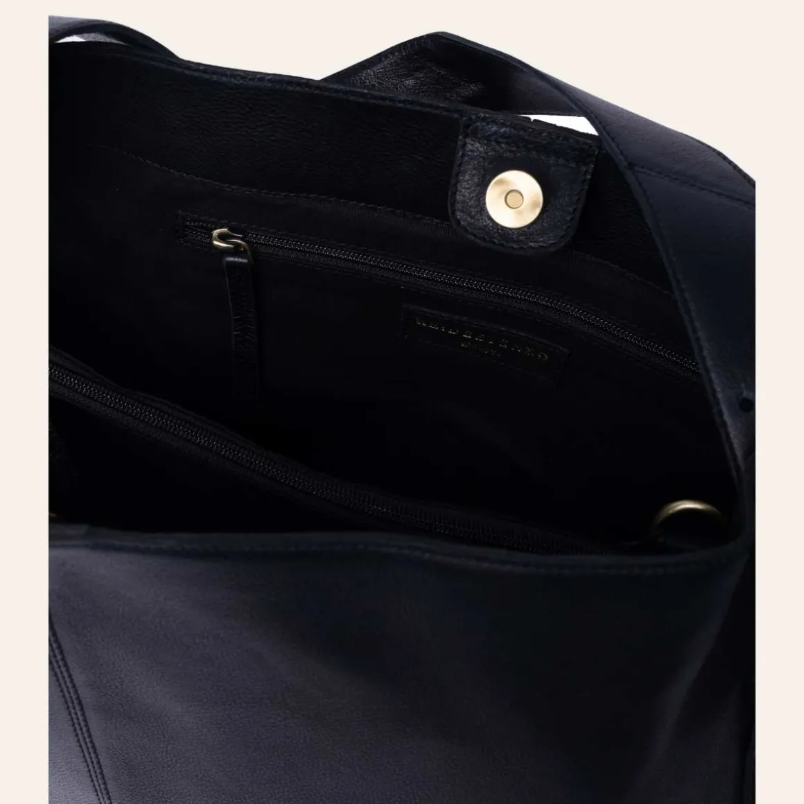 Den har to separate hovedrom med en praktisk glidelåslomme i midten, som gjør det enkelt å organisere innholdet. Vesken lukkes med knapp og har en justerbar skulderrem for komfortabel tilpasning.