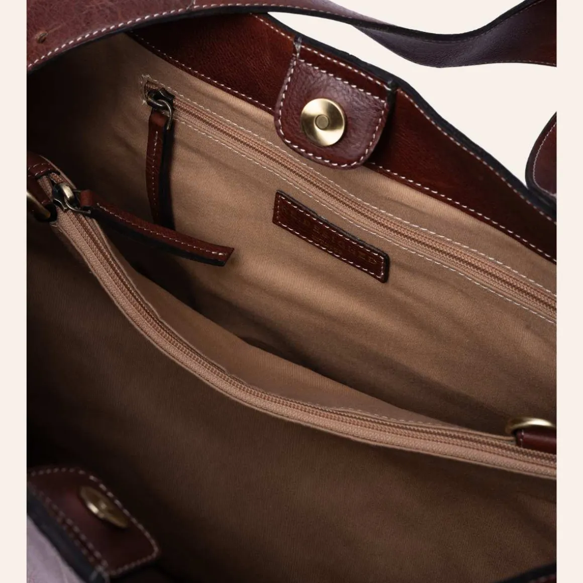 Den har to separate hovedrom med en praktisk glidelåslomme i midten, som gjør det enkelt å organisere innholdet. Vesken lukkes med knapp og har en justerbar skulderrem for komfortabel tilpasning.