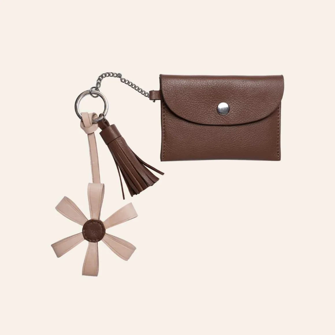 Designet består av en elegant tassel, en dekorativ blomst og en liten pung med knappelukking – praktisk for små mynter eller andre småting du vil ha lett tilgjengelig.