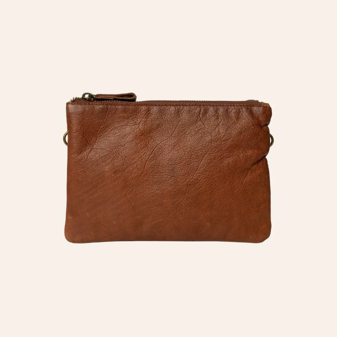 Vesken omsluttes med to glidelåser øverst som fører til to adskilte avdelinger. Ett rom med mindre glidelåslomme og et annet med åpen mobillomme. Den har en avtakbar og justerbar skulderrem i skinn. Bare fest en av stroppene til ringene i begge toppender.