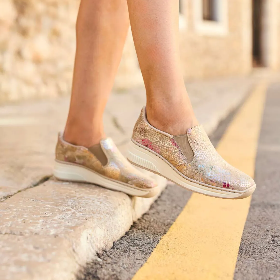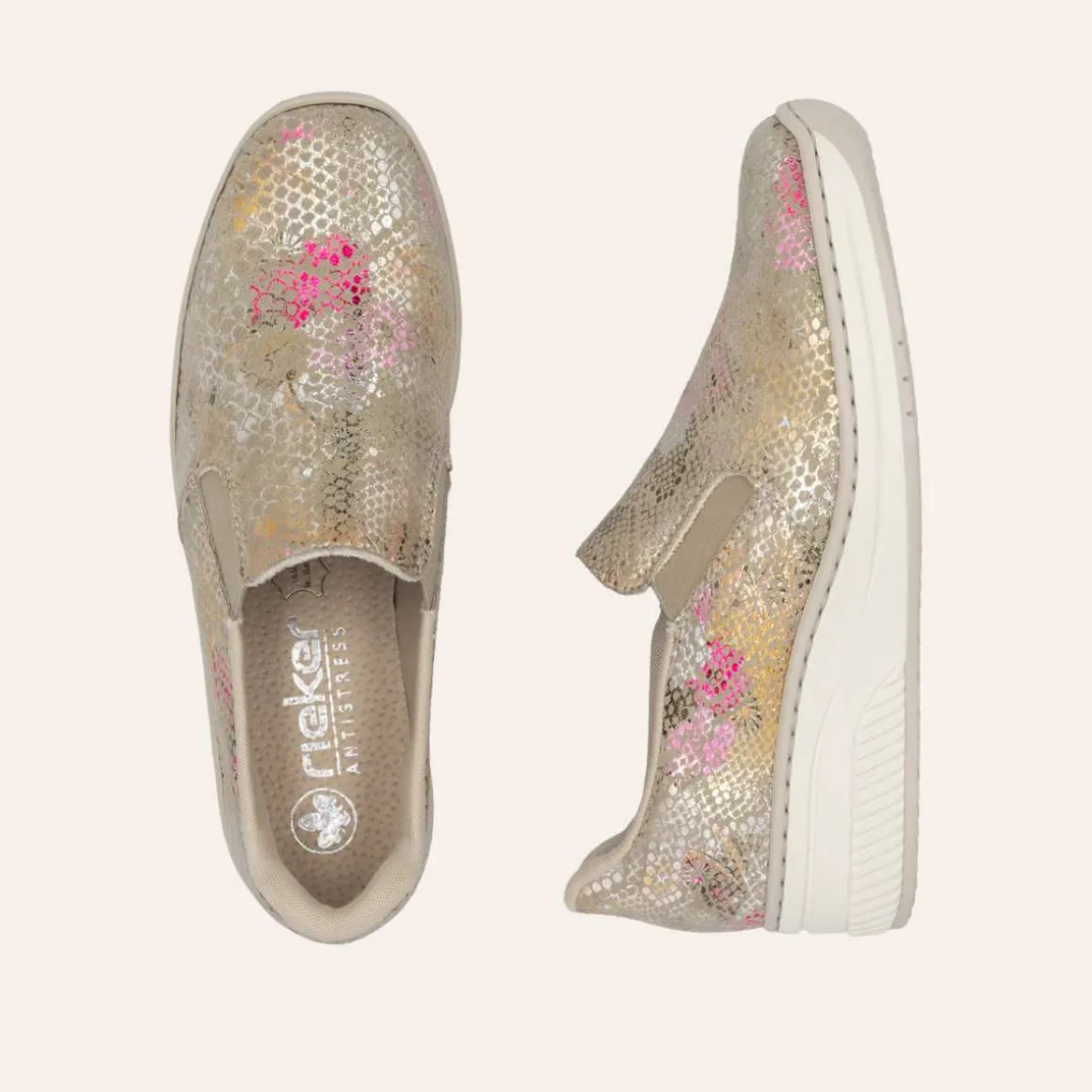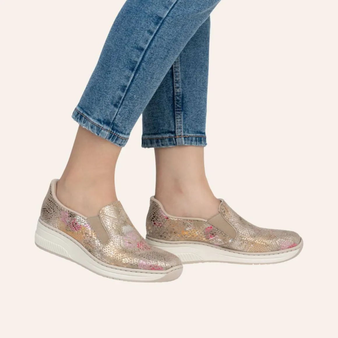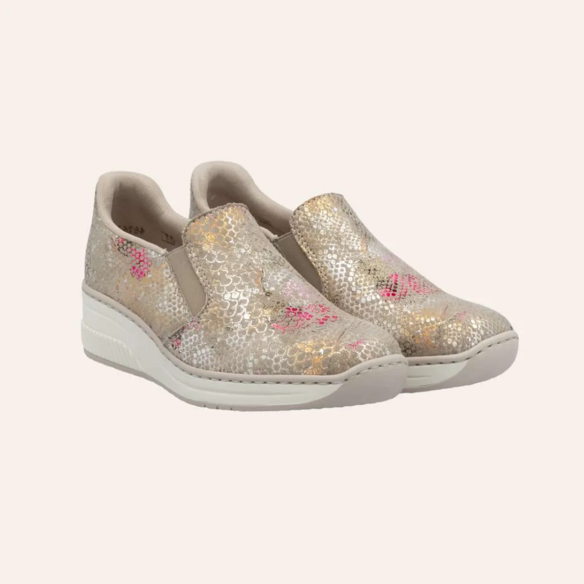 Disse skoene fra Rieker kombinerer stil og funksjonalitet. De vakre fargene danner et elegant mønster som tilfører et eksklusivt uttrykk. Med Hands Free Ready 2 Go-teknologien kan skoene enkelt tas på uten å bruke hendene, takket være den faste hælkappen. Elastikkene ved åpningen gir en behagelig passform, mens den myke skinnsålen med stødabsorbering sikrer komfort hele dagen. Kilehælen på 4,5 cm gir et feminint og moderne preg.
