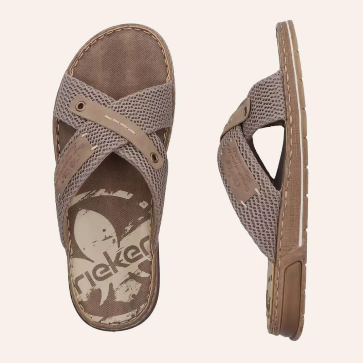 Komfortable herresandaler fra Rieker med kryssede tekstilremmer over foten. Den luftige designen gjør dem perfekte til varme dager.