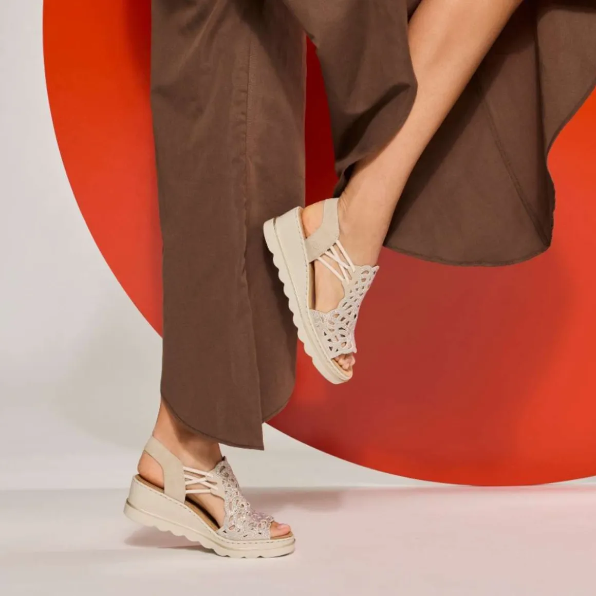 De elastiske detaljene gjør sandalen enkel å ta på og gir en god passform. Den myke sålen med Rieker Antistress gir god demping, mens kilehælen på ca. 5 cm gir et behagelig løft.