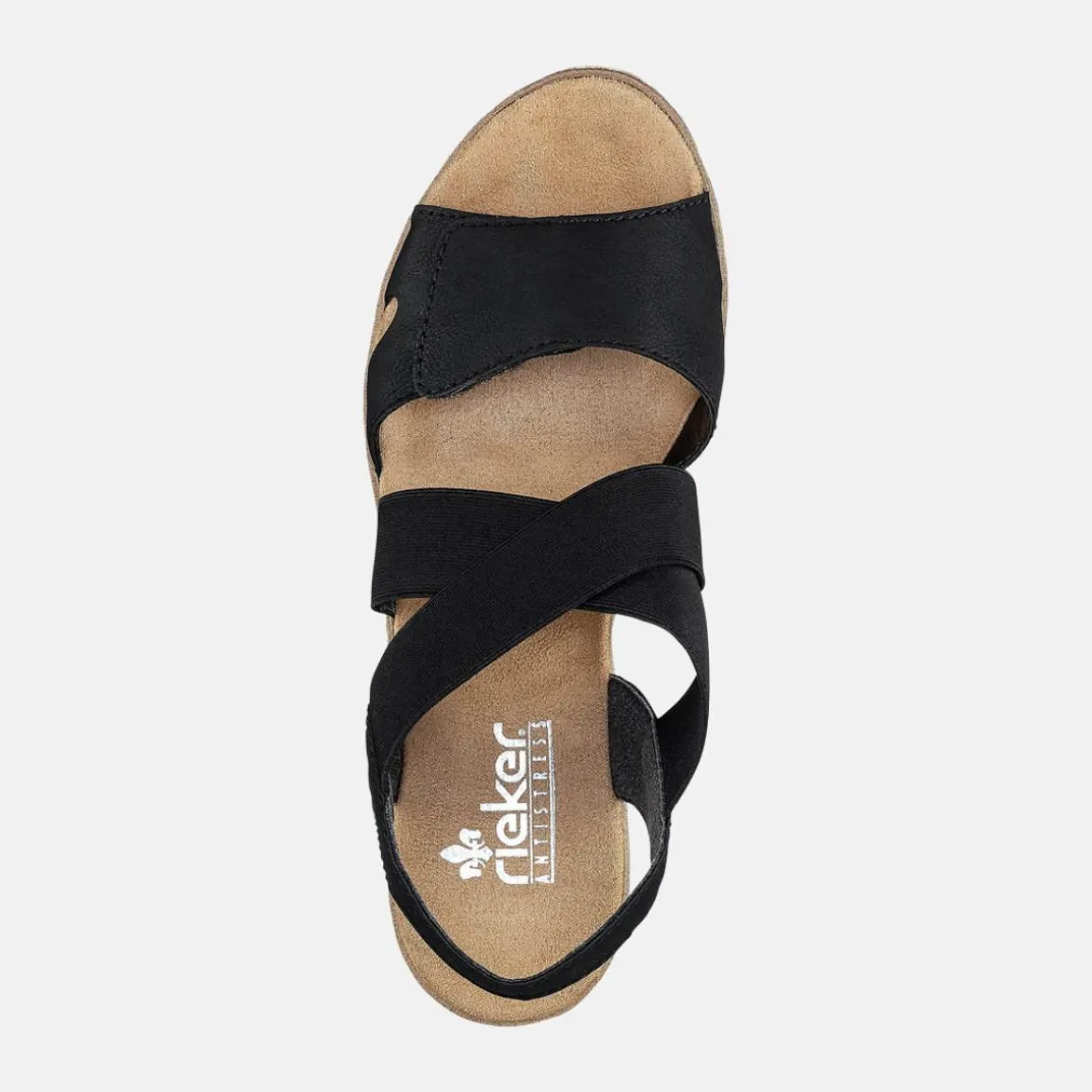 Rieker V38G8-00 sandal i svart for kvinner. Nydelig lett og fleksibel sandal fra Rieker. Modellen har justerbar borrelåslukking ved tærne og hælhøyde på 5 cm.