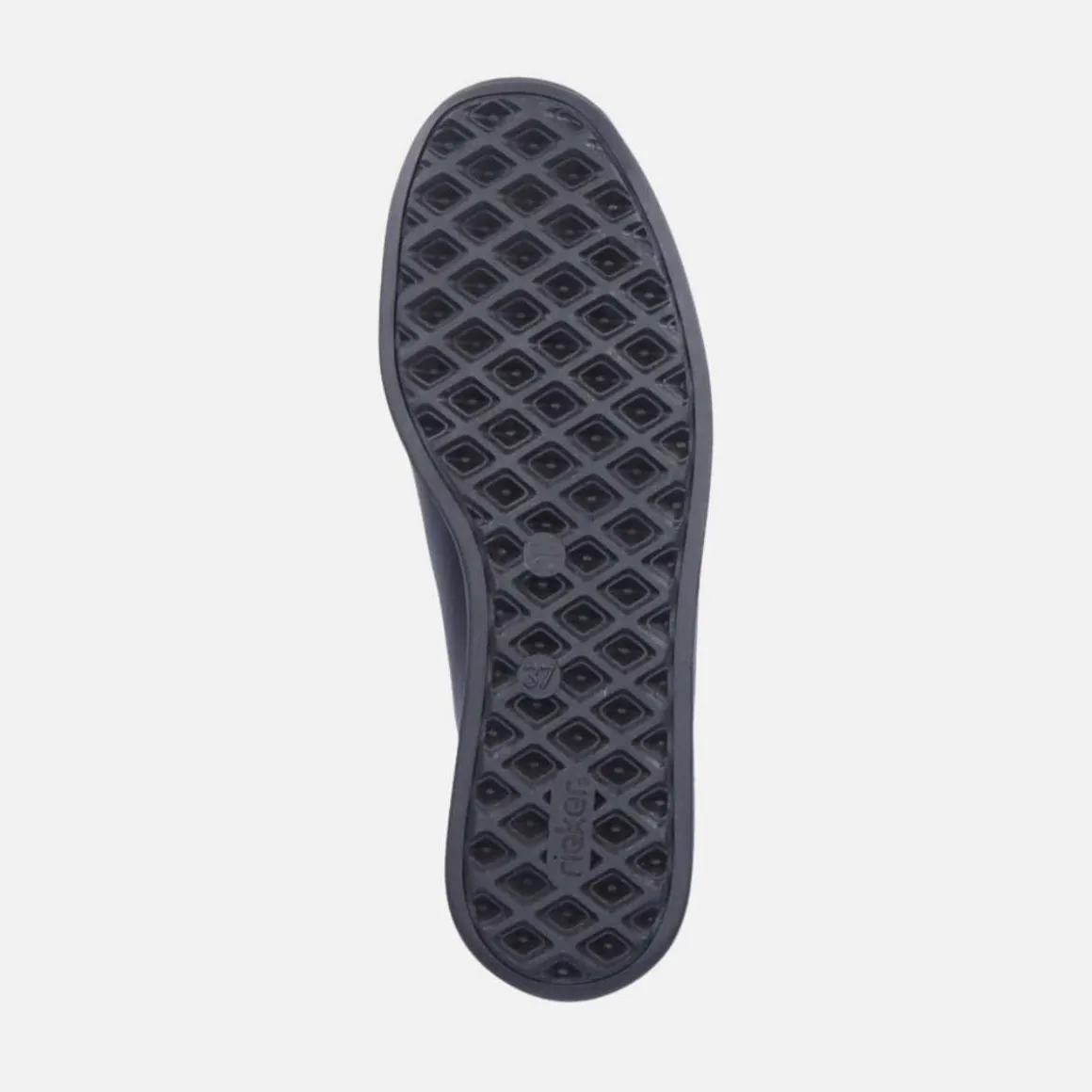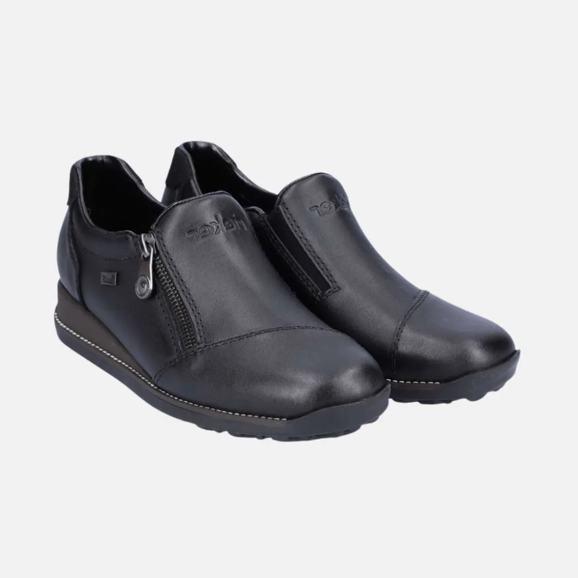 All-time favorite fra Rieker! Disse svarte skoene i glatt skinn imponerer med sitt klassiske design og høye komfort. En sideglidelås gjør det raskt og enkelt å ta dem på. Skoen har en robust profilsåle som gir godt grep for et sikkert steg. Takket være den smale E 1/2 passformen sitter skoen komfortabelt tett uten å klemme. RiekerTEX-teknologien holder føttene tørre i kaldt og fuktig vær.