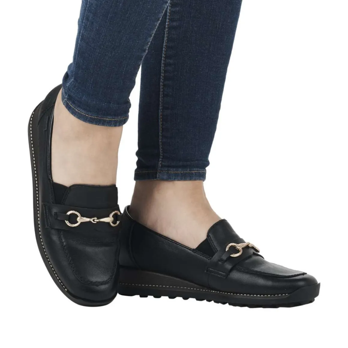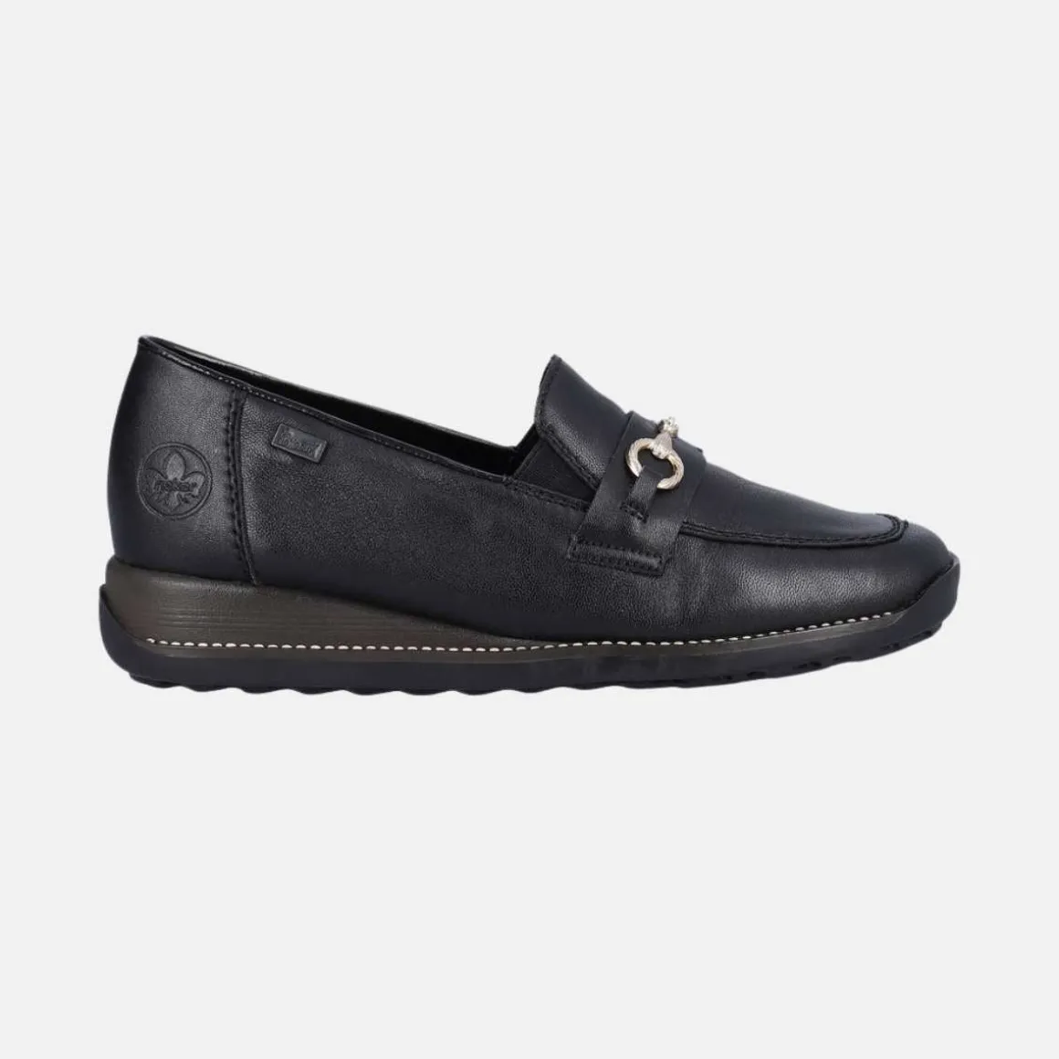 Vær fin og avslappet på farten med disse svarte loafersene i glatt skinn fra RIEKER. Den elastiske innleggsdelen gjør det enkelt og komfortabelt å ta skoen av og på.