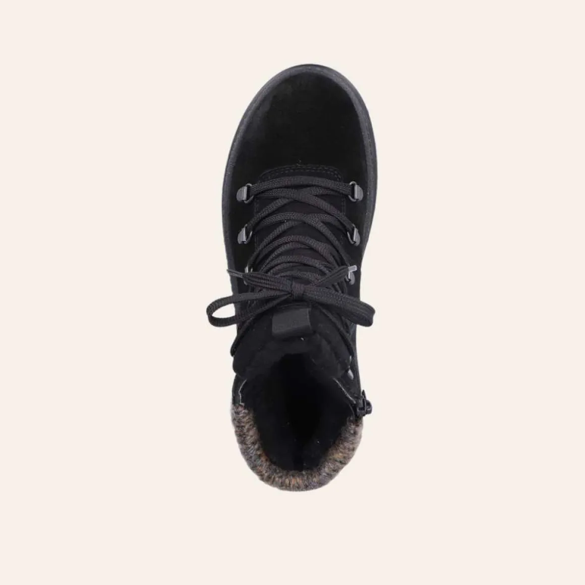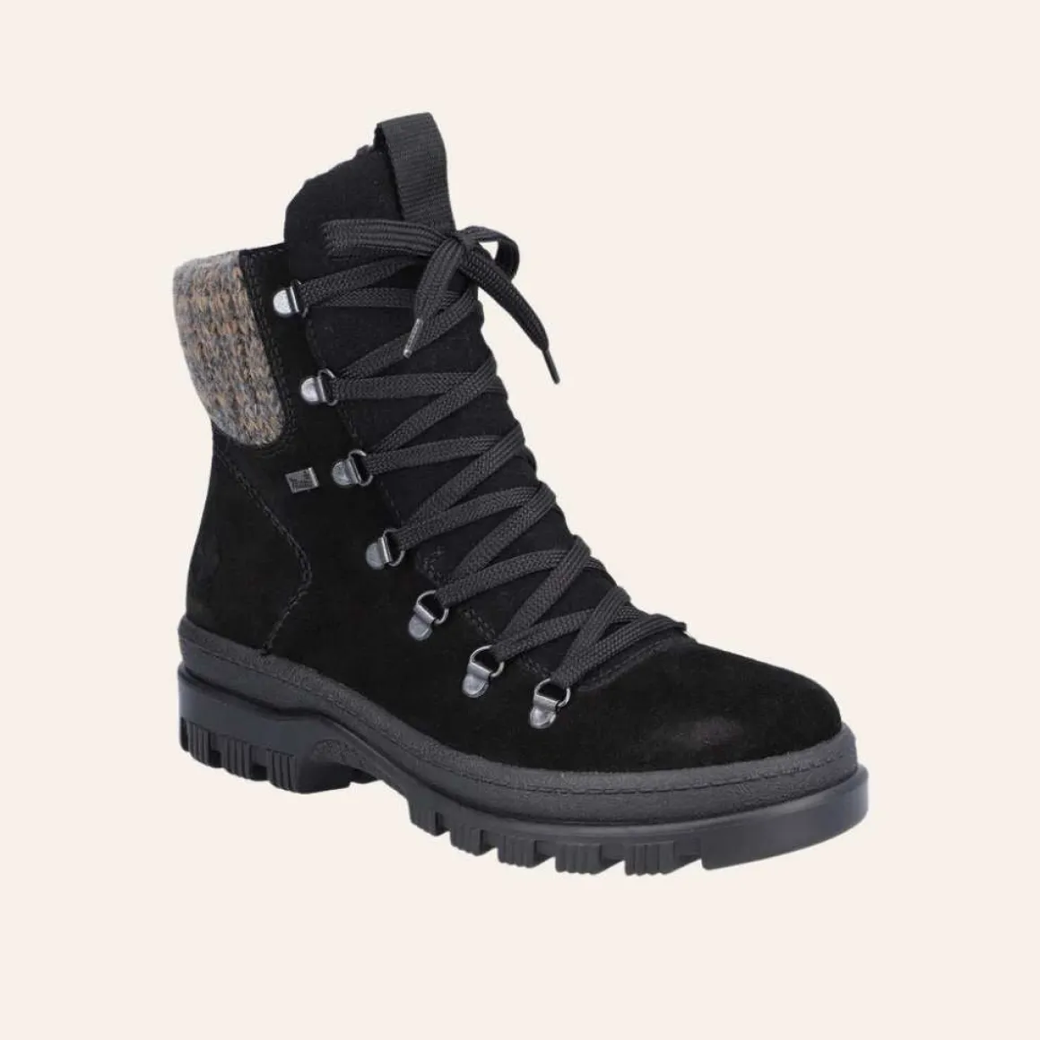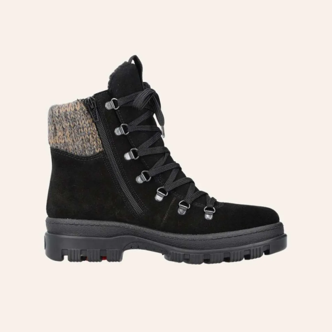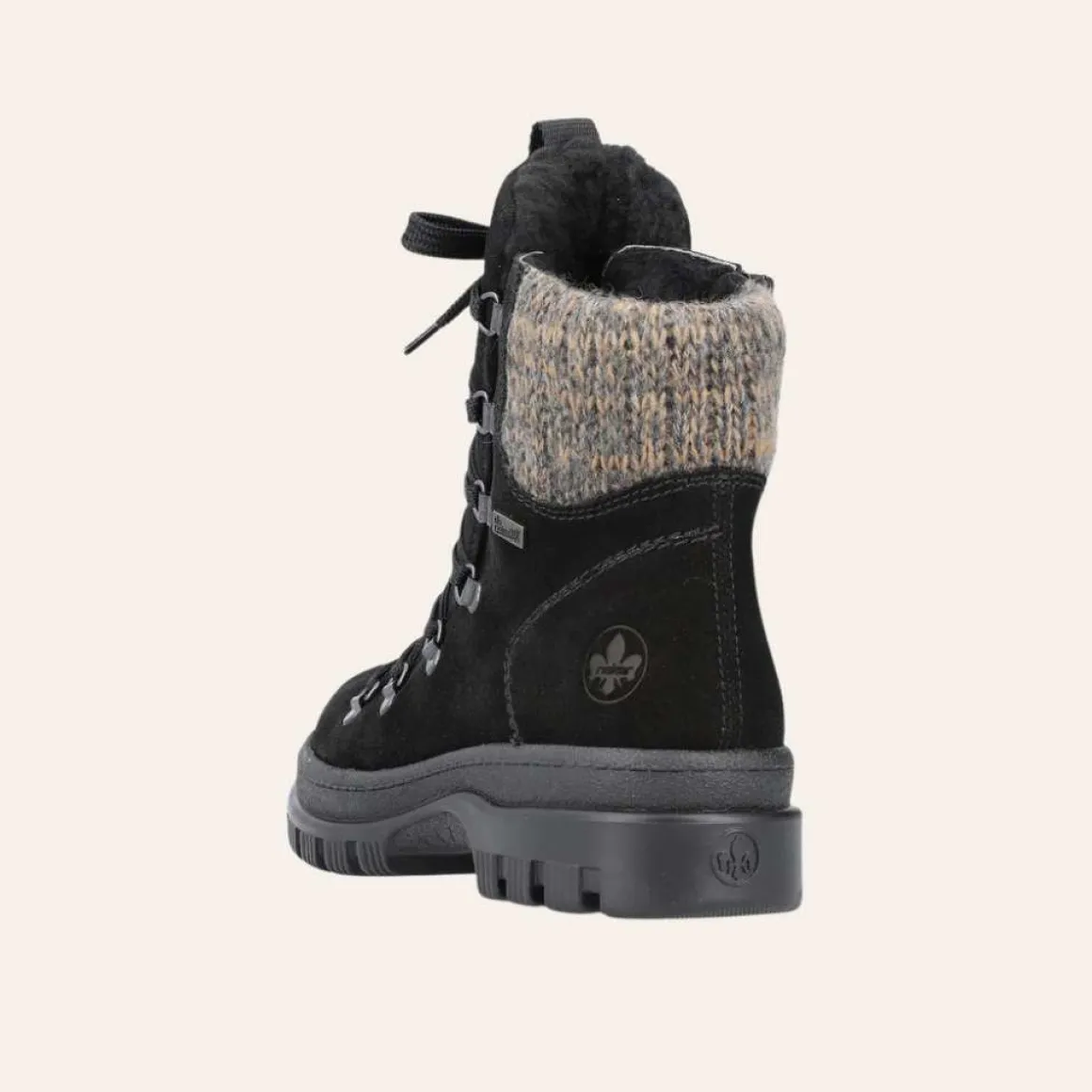 Rieker vintersko med vendbare pigger undere sålen. Varmforet med membran som beskytter mot vann og snø. Glidelås på innsiden, og lisser på fremsiden for optimal passform.