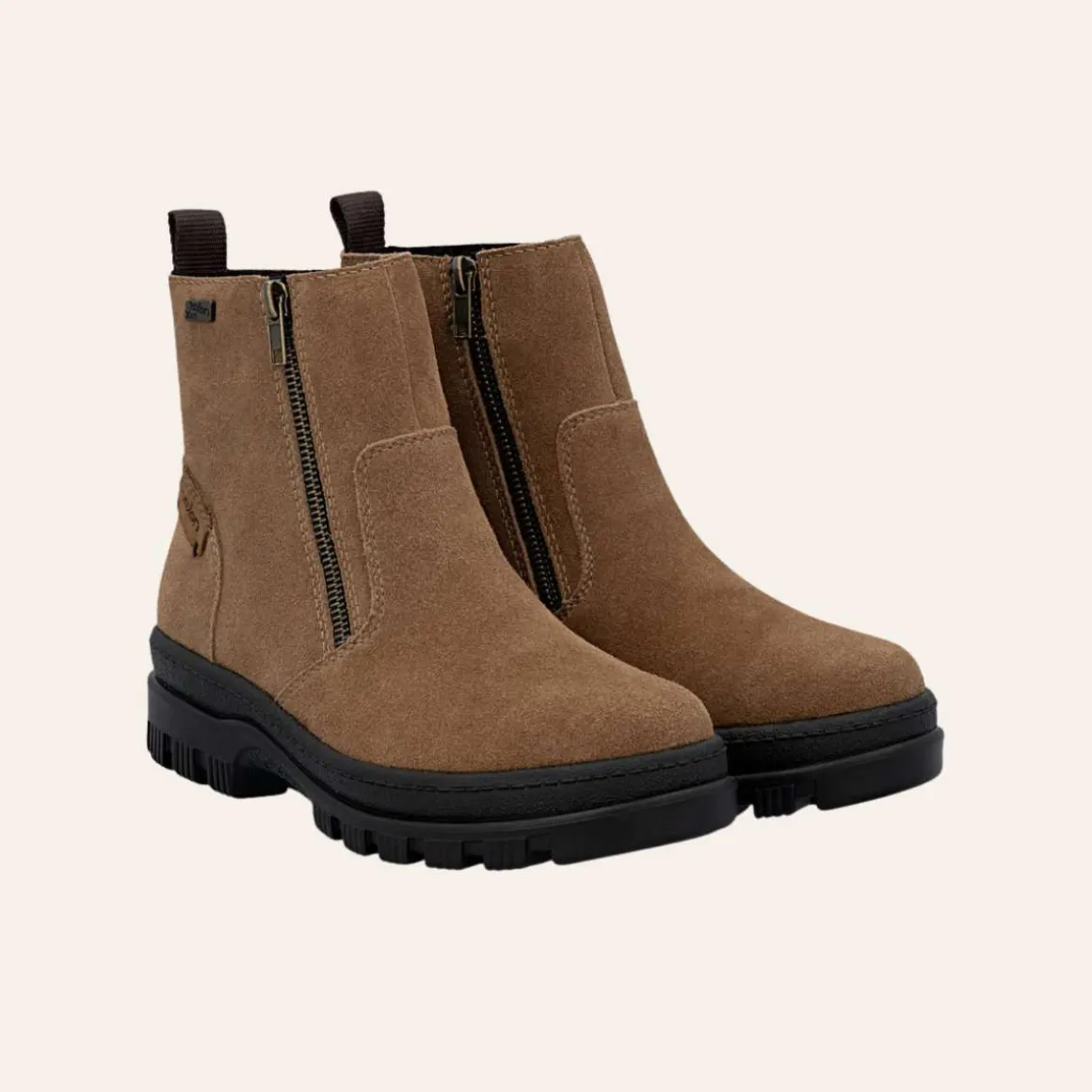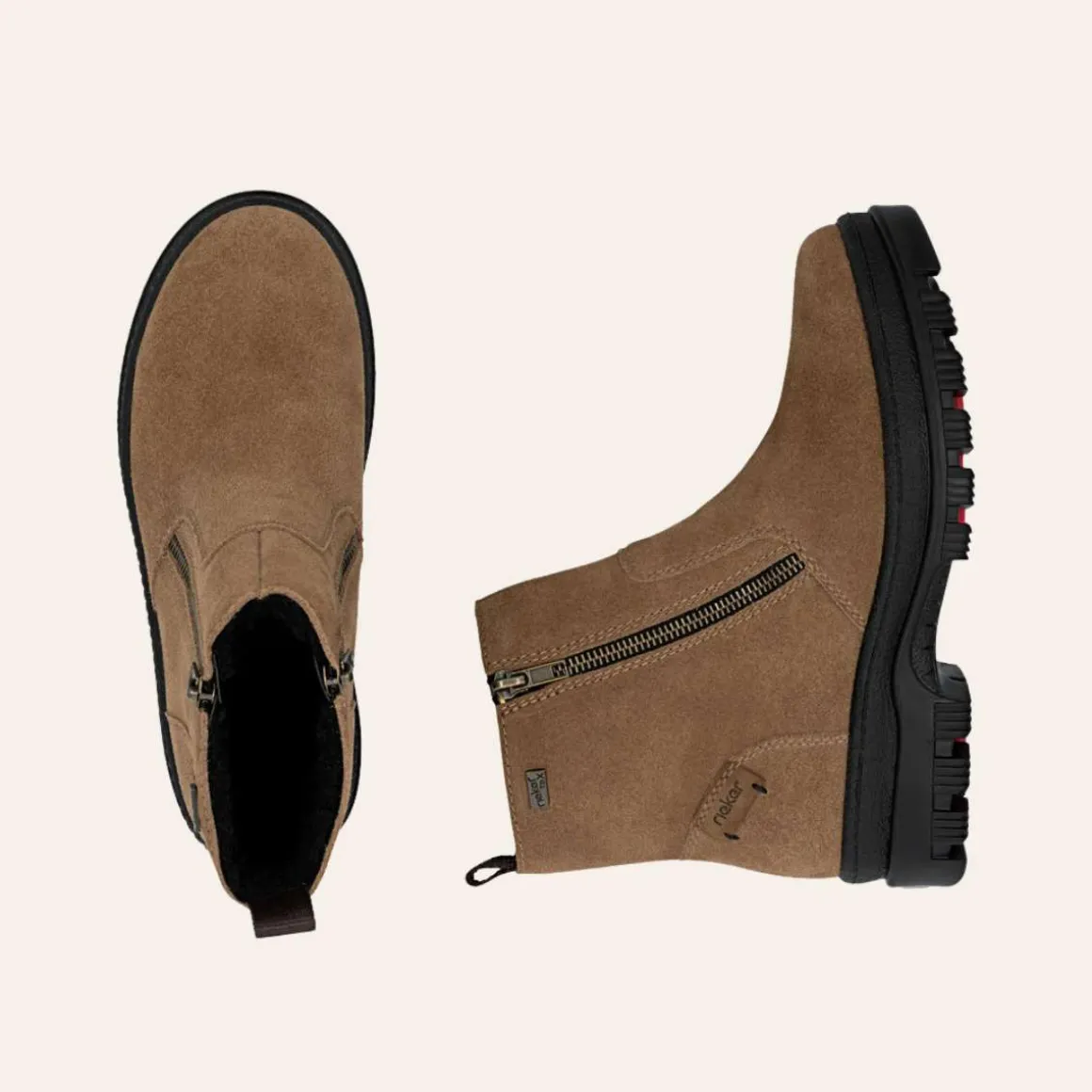Oppdag allsidigheten med Rieker piggsko som kombinerer eleganse med praktisk funksjonalitet. Laget av mykt, ekte skinn, gir disse støvlene både stil og komfort. Den varme og myke ullfôringen holder føttene dine varme, mens den vannavvisende RiekerTex-membranen sørger for at føttene dine holder seg tørre.