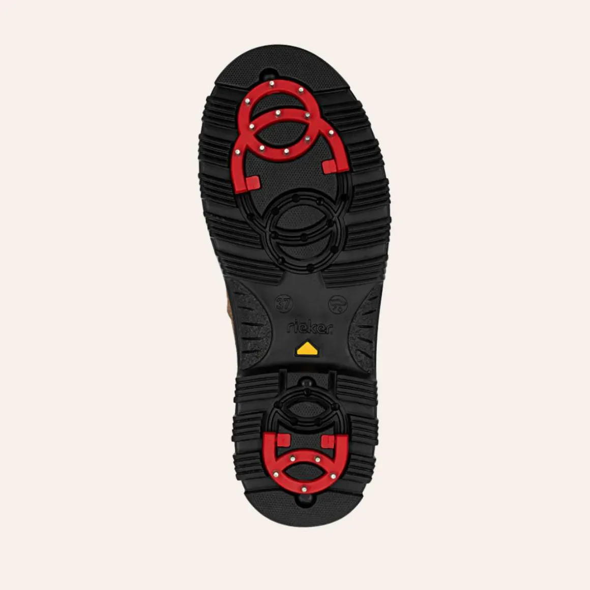 Yttersålen er laget av sklisikkert TR-gummi med et godt mønster og har vendbare pigger. Når du ikke trenger piggene, kan de enkelt vendes inn i sålen, slik at du får en vanlig gummisåle. For ekstra grep på isete underlag, kan du enkelt sette piggene ut med den medfølgende plastnøkkelen (som lett kan festes til et nøkkelring).