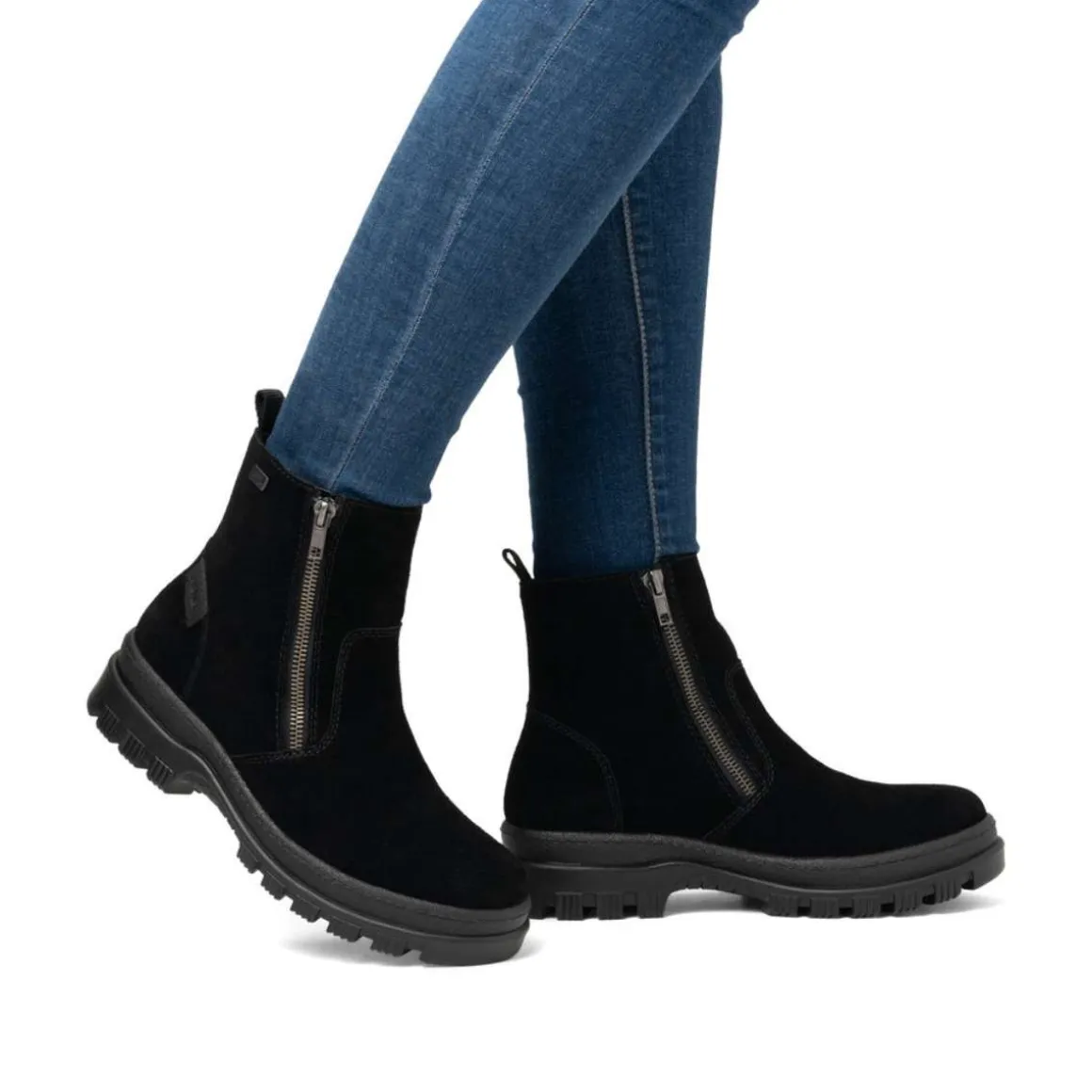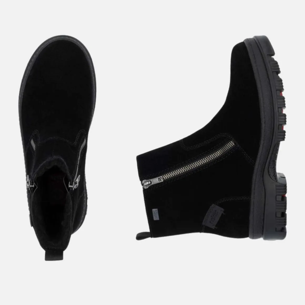 Oppdag allsidigheten med Rieker piggsko som kombinerer eleganse med praktisk funksjonalitet. Laget av mykt, ekte skinn, gir disse støvlene både stil og komfort. Den varme og myke ullfôringen holder føttene dine varme, mens den vannavvisende RiekerTex-membranen sørger for at føttene dine holder seg tørre.