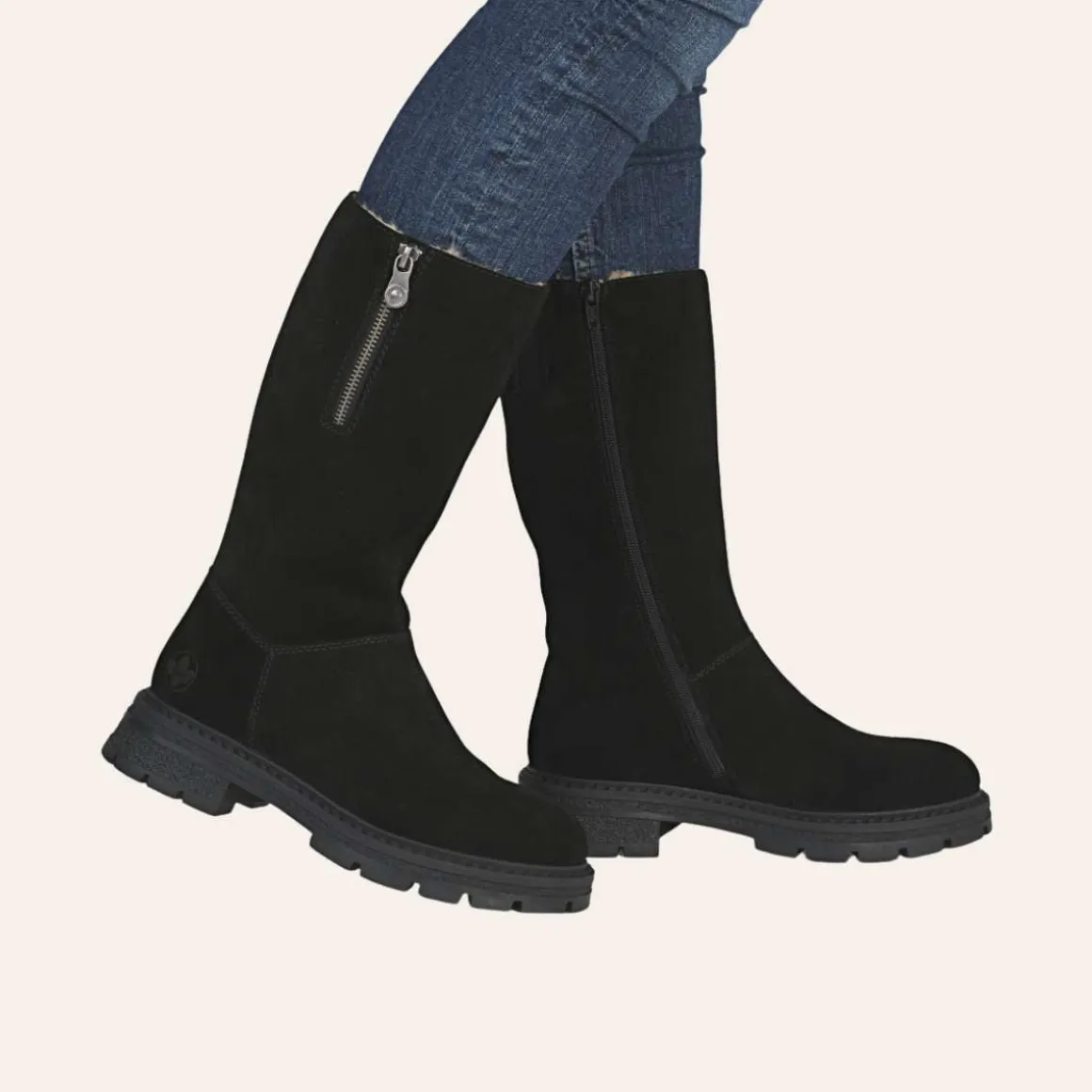 Disse klassiske støvlene i svart skinn fra Rieker med delikate sømmer gir deg både komfort og et elegant uttrykk i hverdagen. En praktisk glidelås på siden gjør det enkelt å ta støvlene av og på, mens en ekstra glidelås øverst kombinert med elastisk innfelt strikk gjør det mulig å justere vidden rundt leggen – perfekt for å sikre en individuell og behagelig passform.