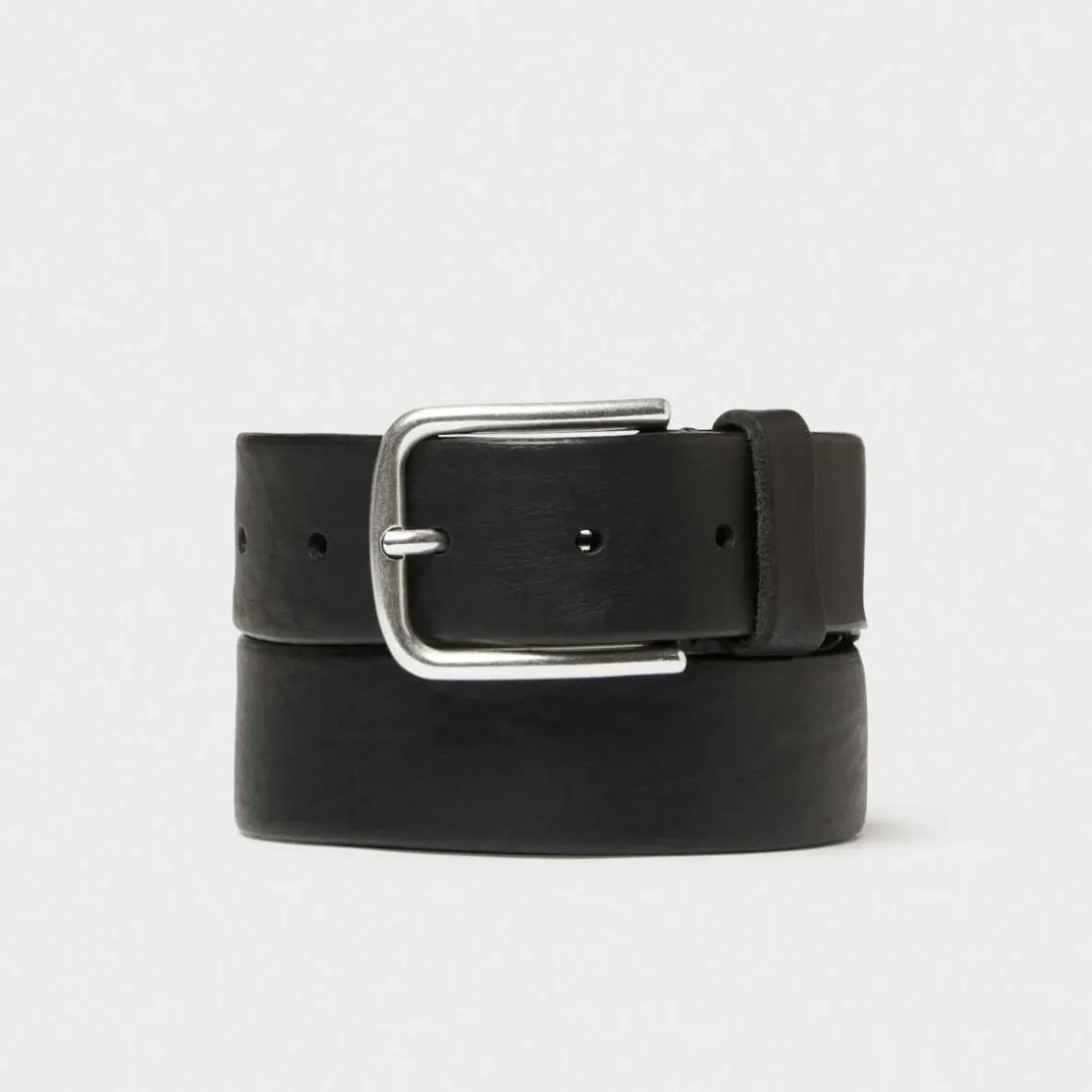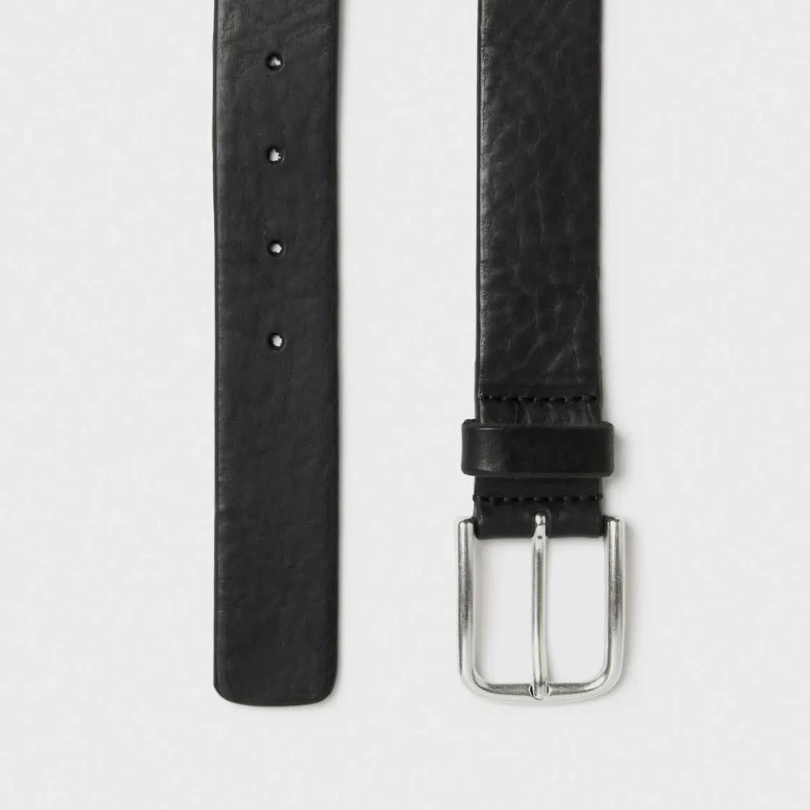 Belt Bergviken fra Saddler. Herrebelte laget av fullnarvet vegetabilsk garvet kuskinn av høyeste kvalitet, behandlet på et garveri sertifisert av Leather Working Group. Spennen er laget av antikksølvfarget metall.