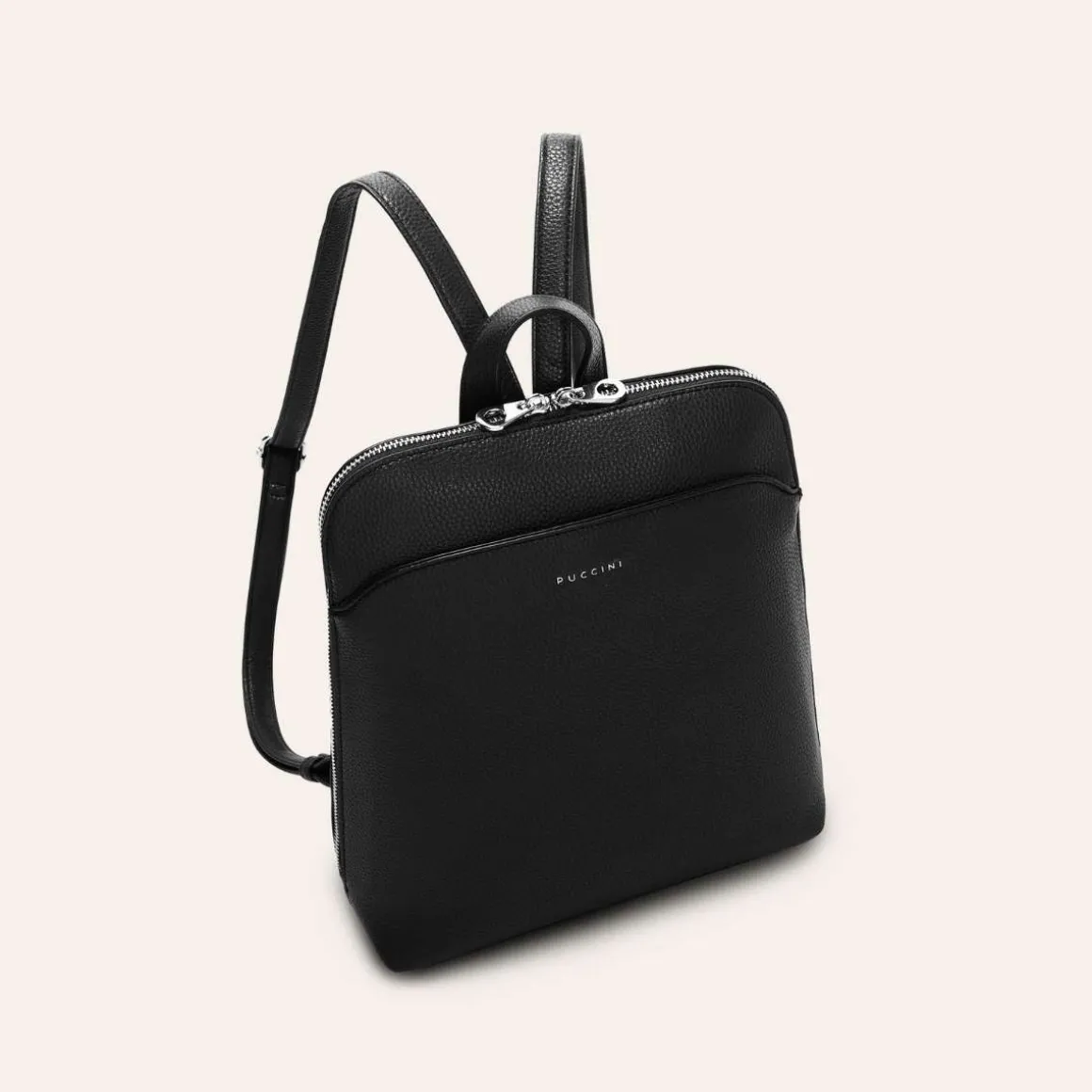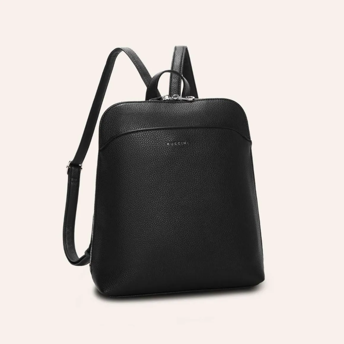 Elegant ryggsekk fra Puccini, laget av strukturert imitert skinn. Den har en praktisk frontlomme med magnetlås og justerbare skulderremmer for komfort. Enkelt håndtak øverst gjør den lett å bære. Med dobbel glidelåsåpning får du rask oversikt over innholdet. Perfekt størrelse for både hverdag og reise!