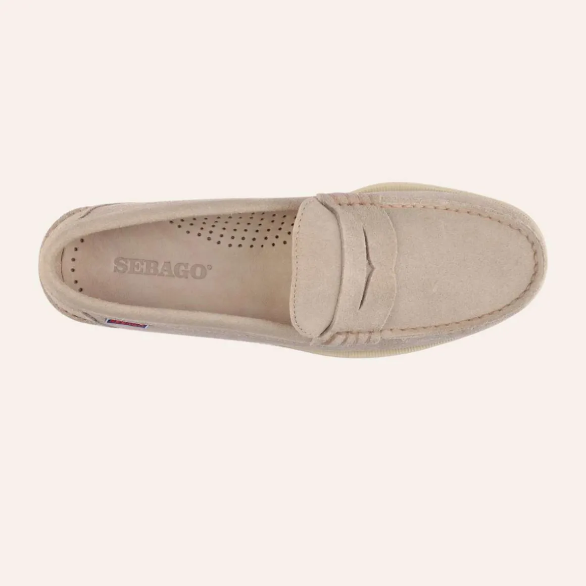 Sebago Dan. Laget av en myk, men tykk og slitesterk semsket kvalitet, og håndsydd med det fineste håndverket. Disse sommerlige slip-on «beefroll» penny loafer-mokasinene for damer er designet med tanke på den finere, feminine foten. De har uforet overdel, innersåle i skinn, og en ikke-merkende, sklisikker gummisåle med riller, typisk for båtsko, som gir stabilt grep under alle værforhold.