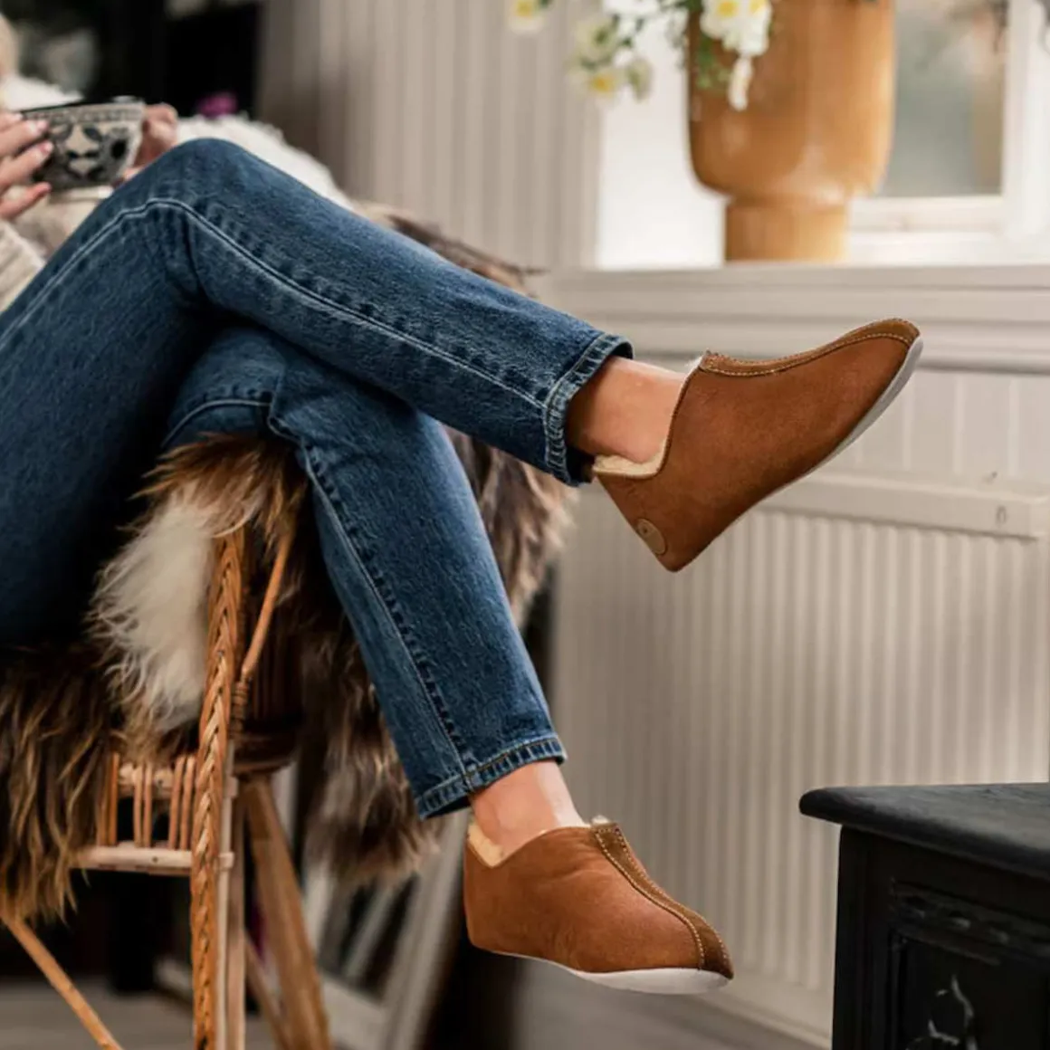Shepherd Lina er et par myke og oppvarmende dametøfler i saueskinn. Tøflene er i en lav ankelmodell med en liten spalte i sidene, noe som gjør dem enkle å ta av og på. Dekorativ kant i semsket skinn og skjenking. Myk såle og semsket skinn.