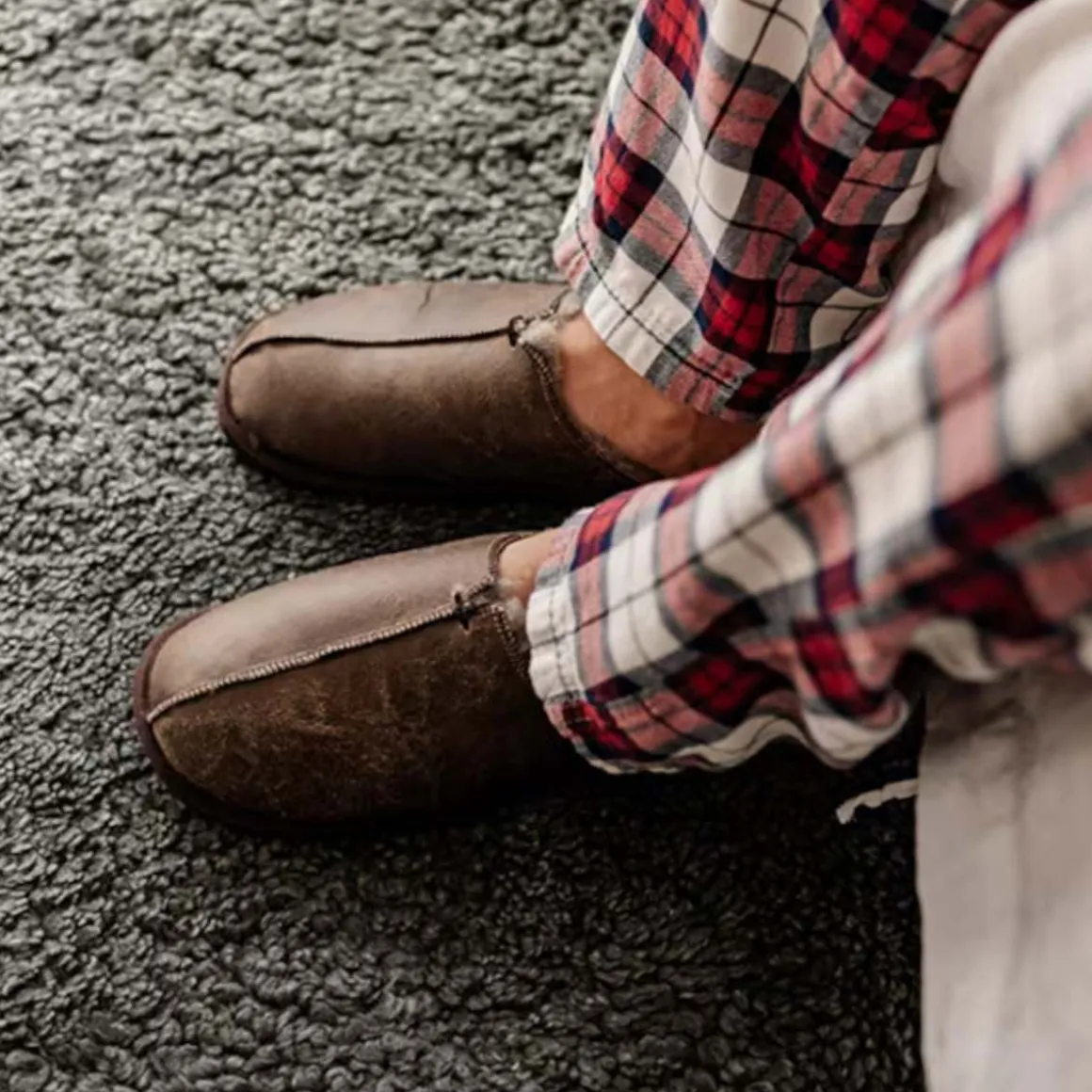 Shepherd Hugo er et par varme menns tøfler i saueskinn. Tøflerne er i en klassisk slip-in-modell med en liten spalte foran og en dekorativ overflatesøm. Tekstilkant rundt sålen. Yttersåle i EVA.