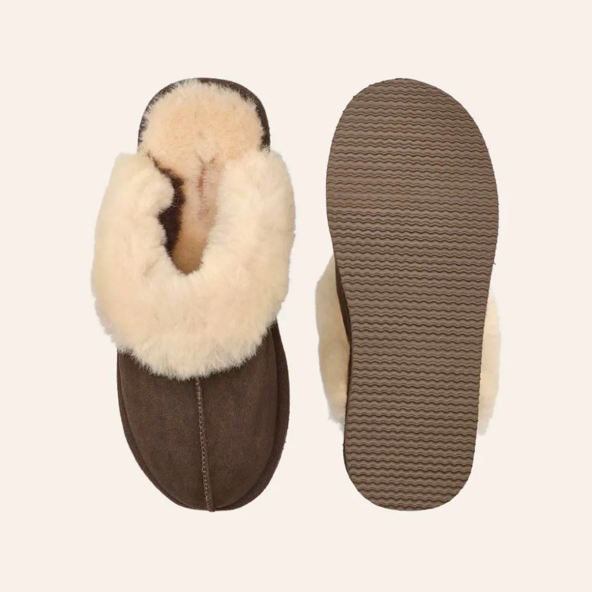 Shepherd Jessica. Et par klassiske slip-in tøfler med bred saueskinnskrage. Dekorativ utvendig søm foran. Tekstilkant rundt sålen. Yttersåle i EVA.