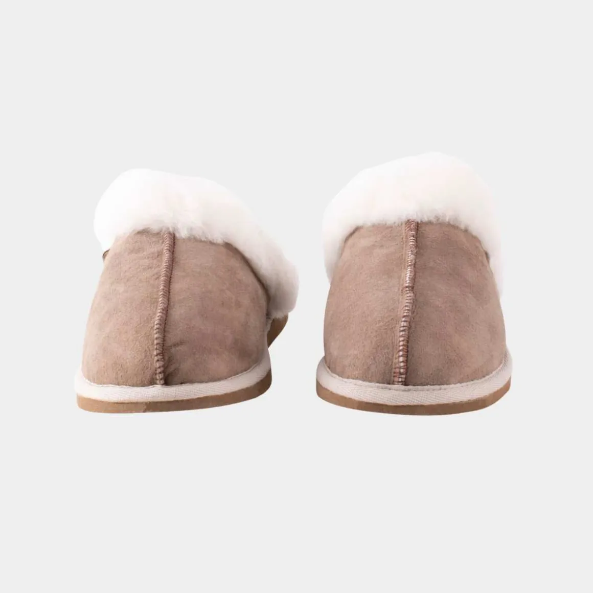 Hyrde Jessica. Et par klassiske slip-in tøfler med bred saueskinnskrage. Dekorativ utvendig søm foran. Tekstilkant rundt sålen. Yttersåle i EVA.
