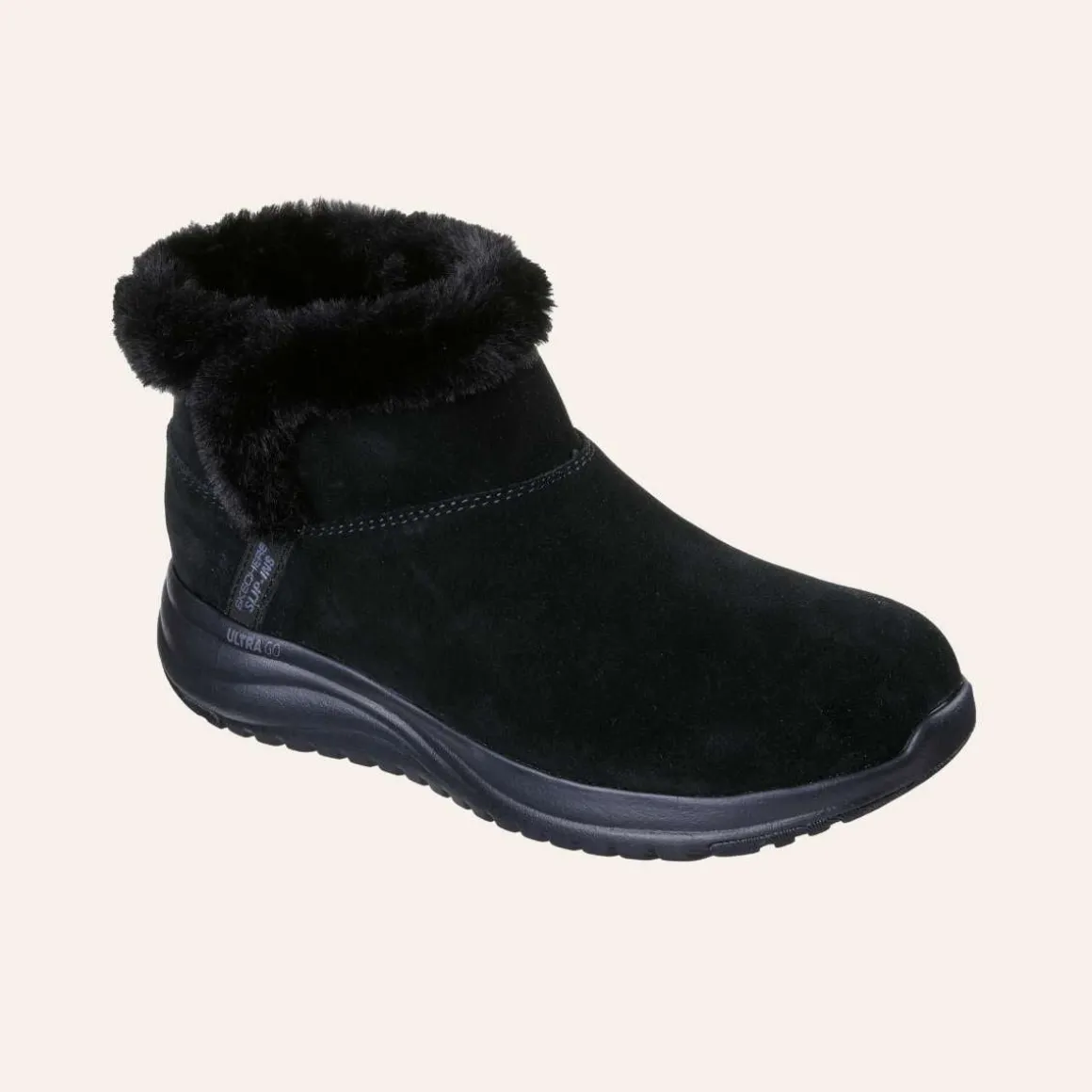 Nyt klassisk, koselig stil med førsteklasses Skechers-komfort i Skechers Hands Free Slip-ins®: On-the-GO® Stellar – Daphne. Designet med vår Heel Pillow®, er denne vanntette slip-on-støvelen laget med semsket overlær i lav modell med fuskepelsdetaljer og fôr, en Skechers Air-Cooled Goga Mat™-innersåle og lett ULTRA GO®-mellomsåle for demping.