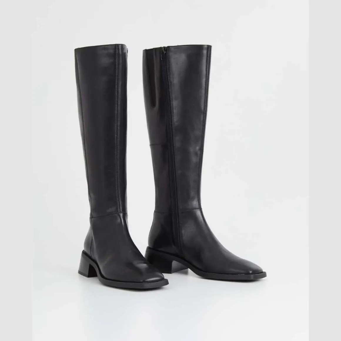 Blanca er et ekte Vagabond-ikon. Den knehøye støvletten er laget i sort skinn og har en subtilt firkantet tåform. Hælen er lett utsvingt og måler 47 mm. Detaljer inkluderer glidelås langs innsiden, en midtsøm samt innersåle i kromfritt skinn.
