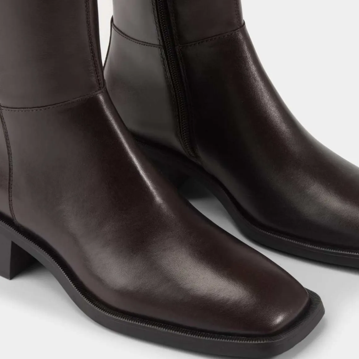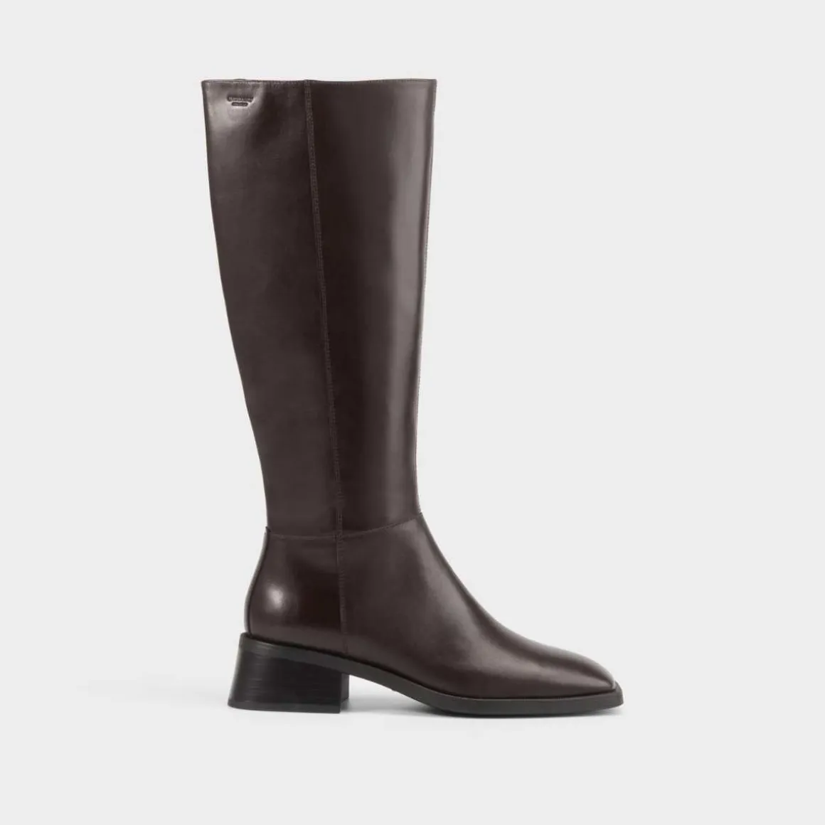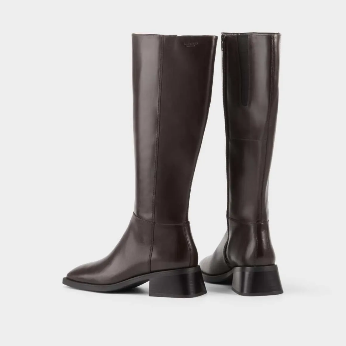 Blanca er et ekte Vagabond-ikon. Den knehøye støvletten er laget i mørkebrunt skinn og har en subtilt firkantet tåform. Hælen er lett utsvingt og måler 47 mm. Detaljer inkluderer glidelås langs innsiden, en midtsøm samt innersåle i kromfritt skinn.
