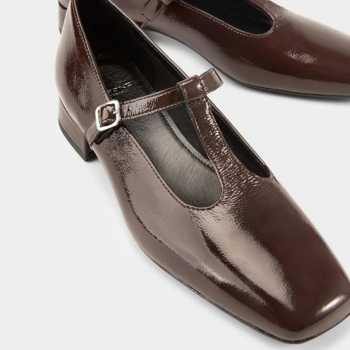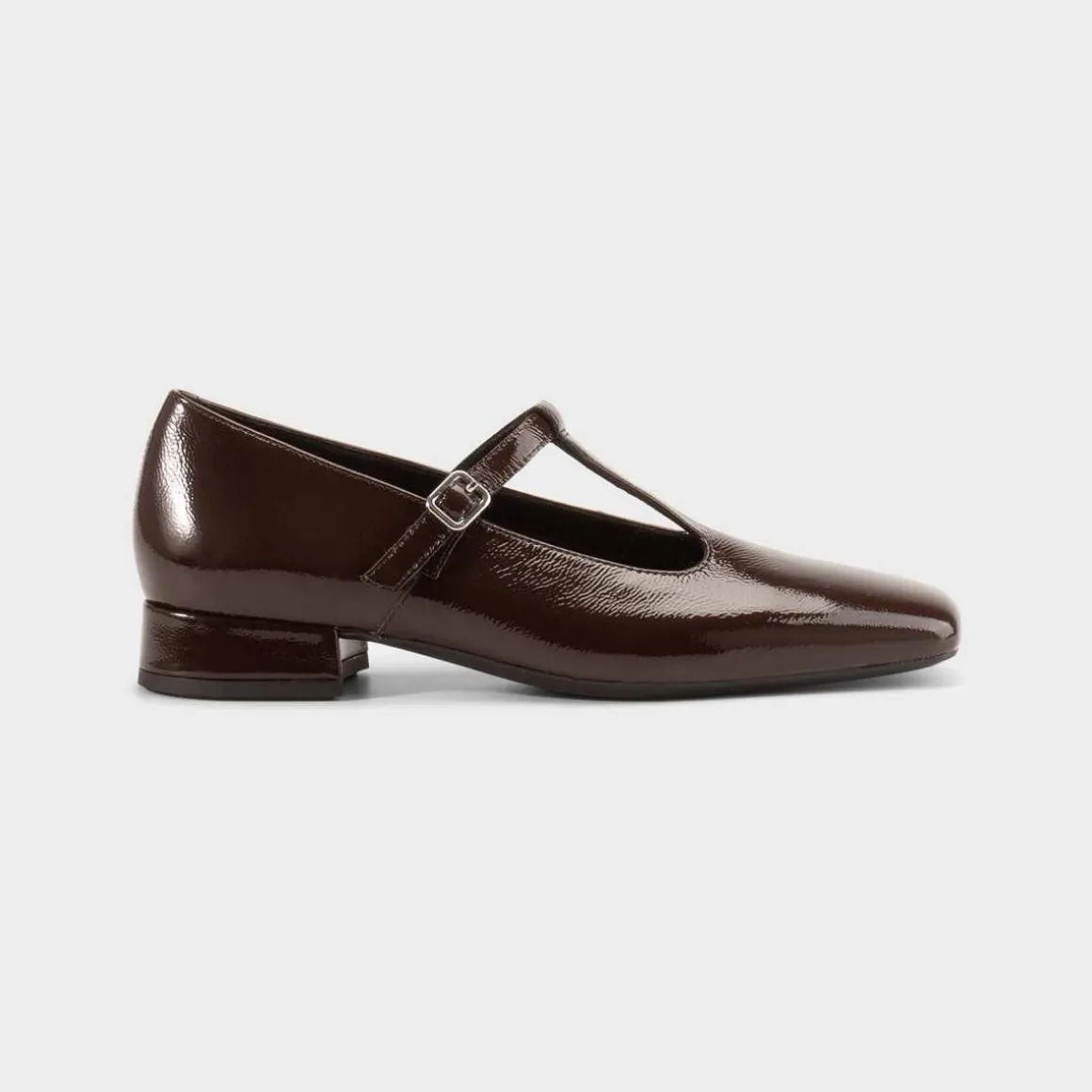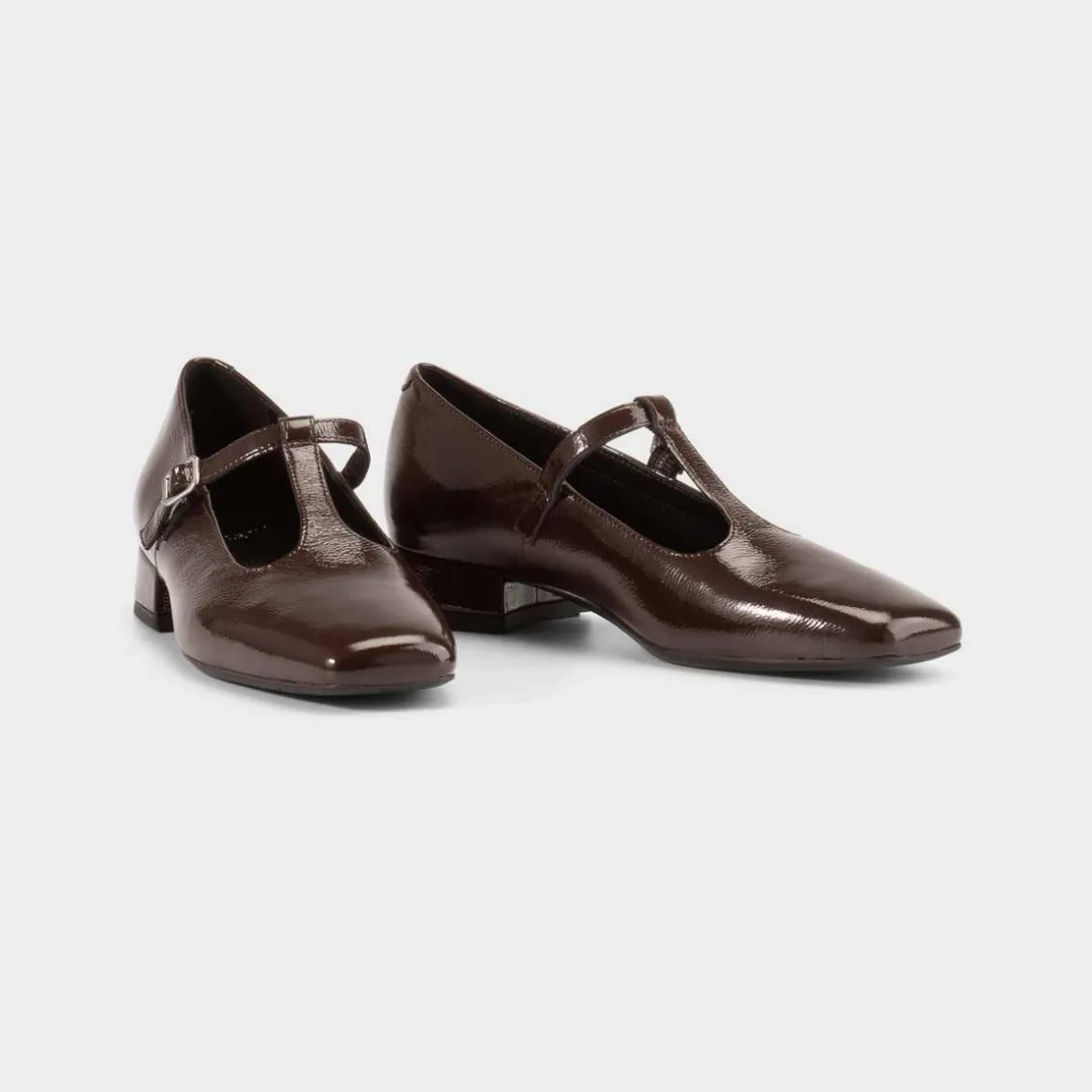 Klassiske Mary Jane-pumps fra Vagabond med et sofistikert uttrykk. Debbi er laget i mørkebrunt lakkert skinn og har en T-stropp.