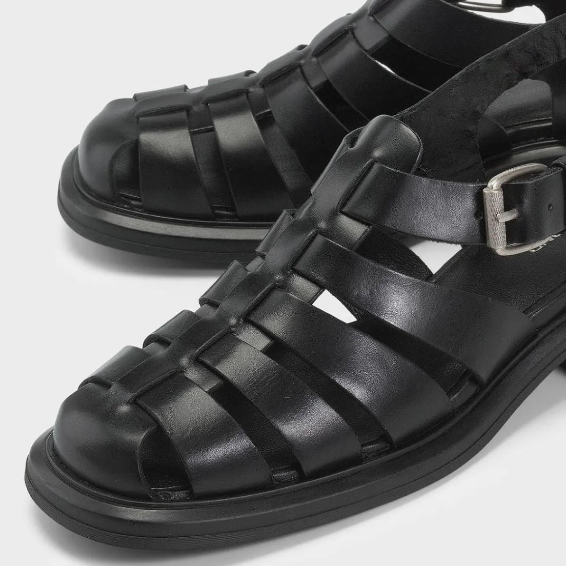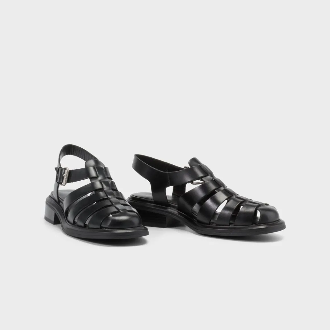 Ellis fra Vagabond gir en moderne vri på fiskersandalen. Modellen er laget av svart skinn og har en flettet overdel, avrundet tåform og en justerbar ankelrem med en sølvfarget spenne. Hælene måler 25 mm.