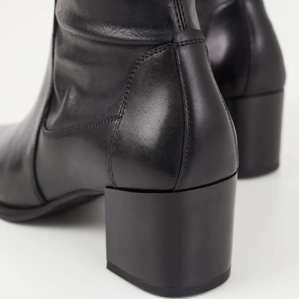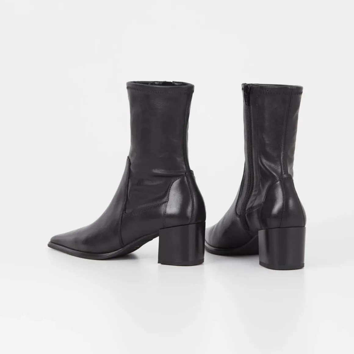 Giselle er minimalistiske stretchstøvletter med en avsmalnende silhuett. Modellen er laget i svart skinn/syntetisk skinn med et mellomhøyt skaft, spiss tå og glidelås langs innsiden av skaftet. Hælen måler 57 mm.