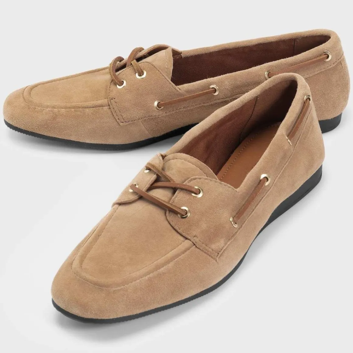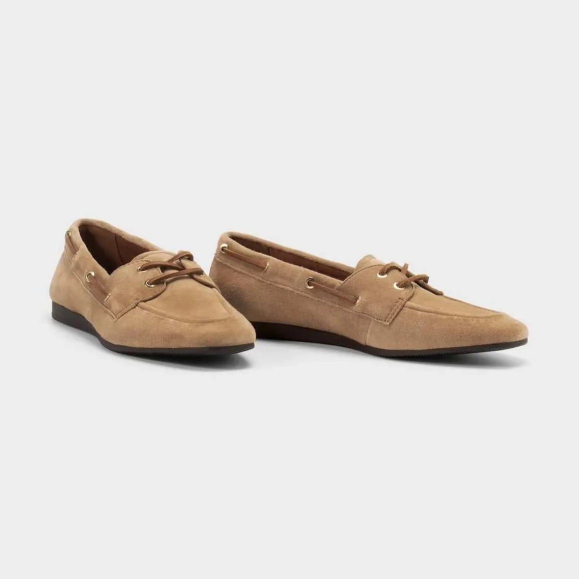 Hillary er våre sporty hybrider – en moderne tolkning av klassiske lave sko. Seilerskoen er laget i lysebrunt semsket skinn.