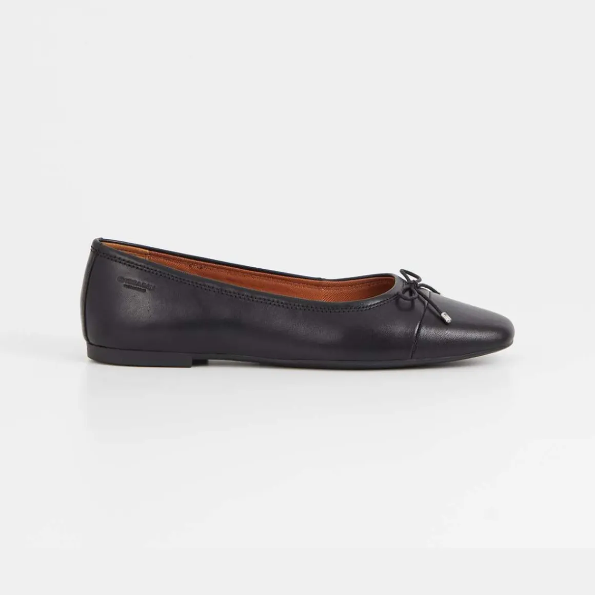 Jolin er klassiske ballerinasko med en tidløs silhuett. Modellen er i sort skinn med avrundet tå, pen såle og dekorativ sløyfe på overdelen. Den lave hælen måler 11 mm.