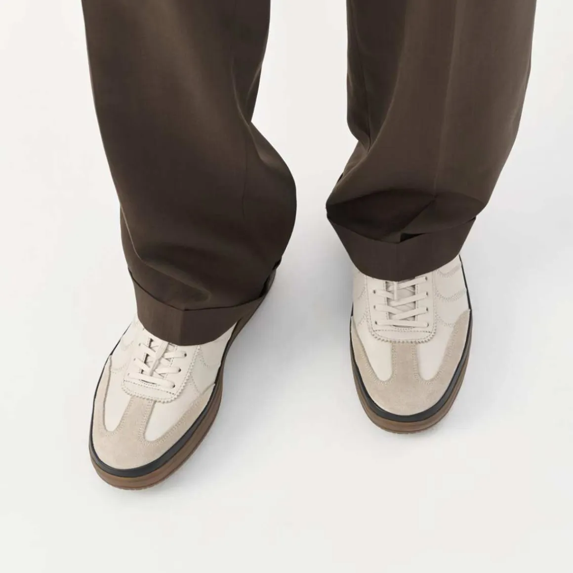 Leo kombinerer et moderne uttrykk med en sporty stil. Sneakersene er laget av beige skinn, med kontrasterende svarte detaljer, T-formet tådesign i semsket skinn og brune gummisåler.