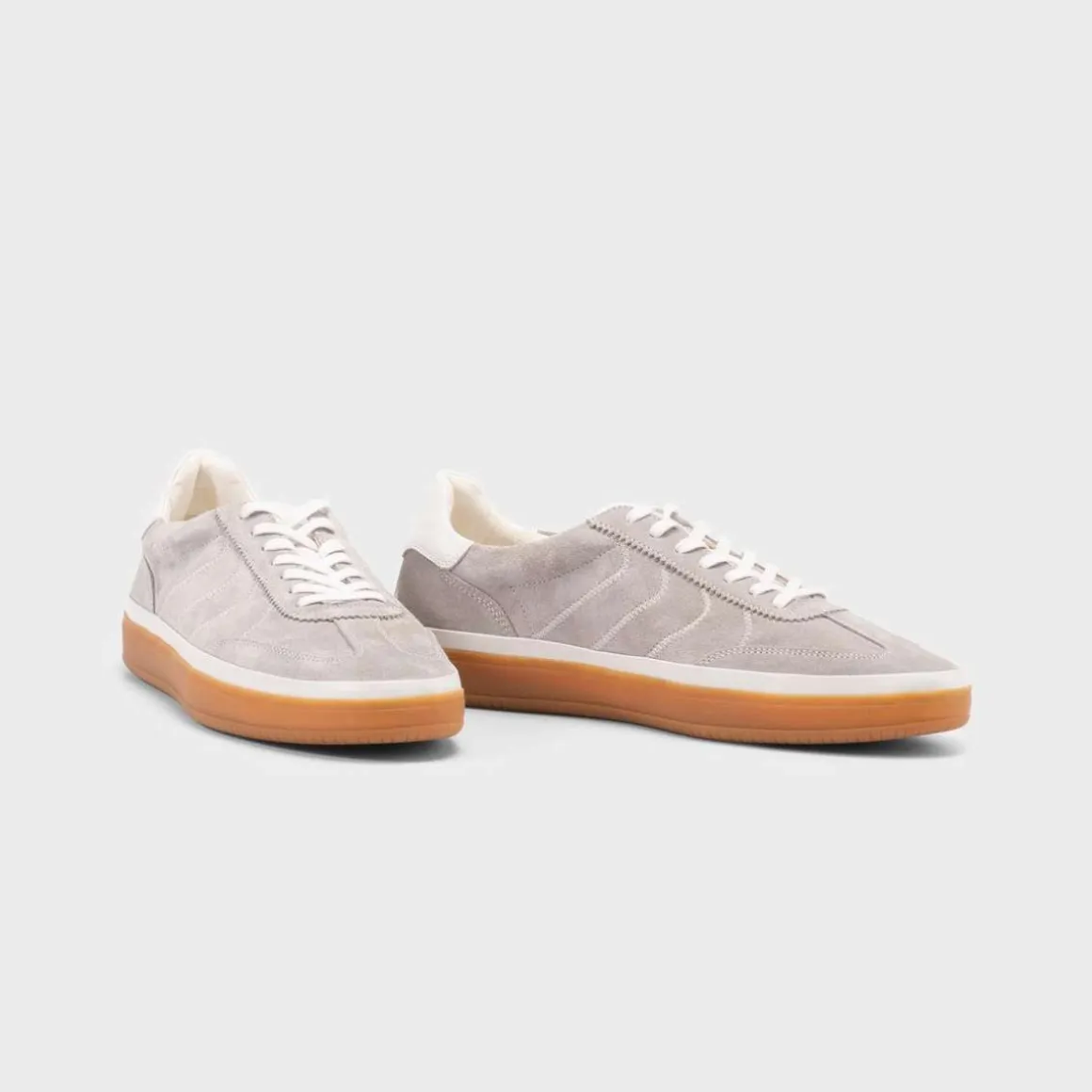 Leo er moderne sneakers med et sporty uttrykk. De stilrene skoene er laget av grått semsket skinn, med dekorative sømmer, T-formet tådesign og honningfargede gummisåler.