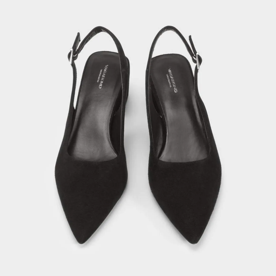 Marta fra Vagabond er et par moderne slingbacks med en raffinert silhuett. Laget av svart semsket skinn, har disse hælene en subtilt spiss tåform og en justerbar slingback-rem med spenne. Blokkhælene måler 50 mm, og detaljene inkluderer polstrede skinninnersåler.