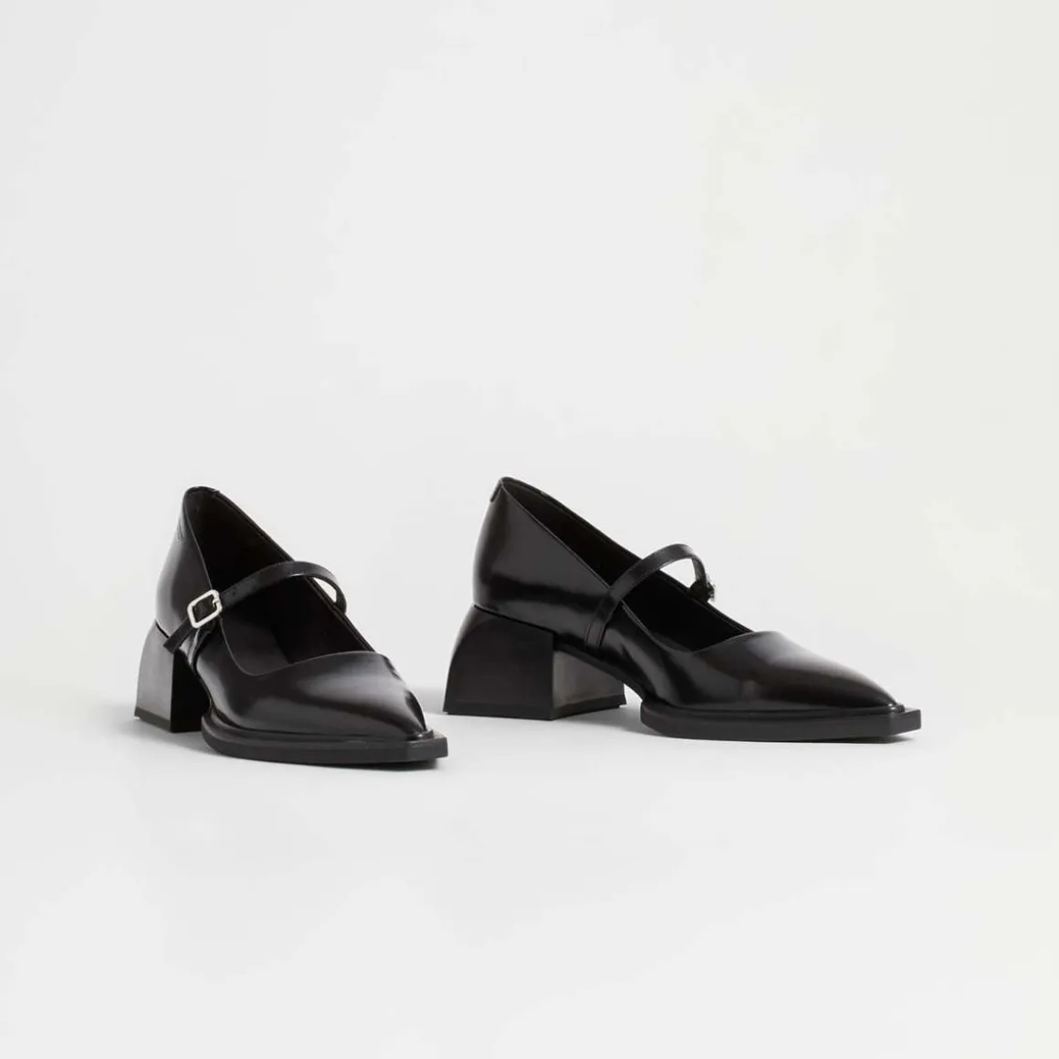 Vivian er moderne Mary Jane-inspirerte pumps med en edgy silhuett. Modellen er laget i svart, polert skinn med skarp, spiss tå og en justerbar stropp med sølvfarget spenne. Den skulpturerte hælen måler 55 mm.