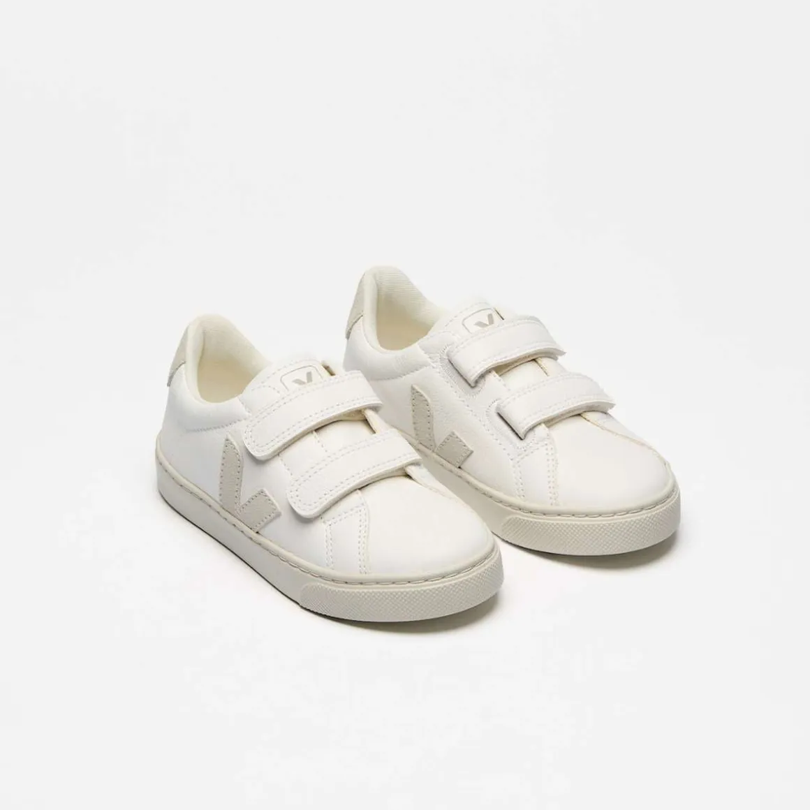 VEJA Esplar Kids er en stilren og komfortabel barnesneaker i klassisk hvit med beige-detaljer. Modellen er laget i organisk sporet skinn (O.T.), som sikrer sporbarhet og ansvarlig produksjon gjennom hele verdikjeden.