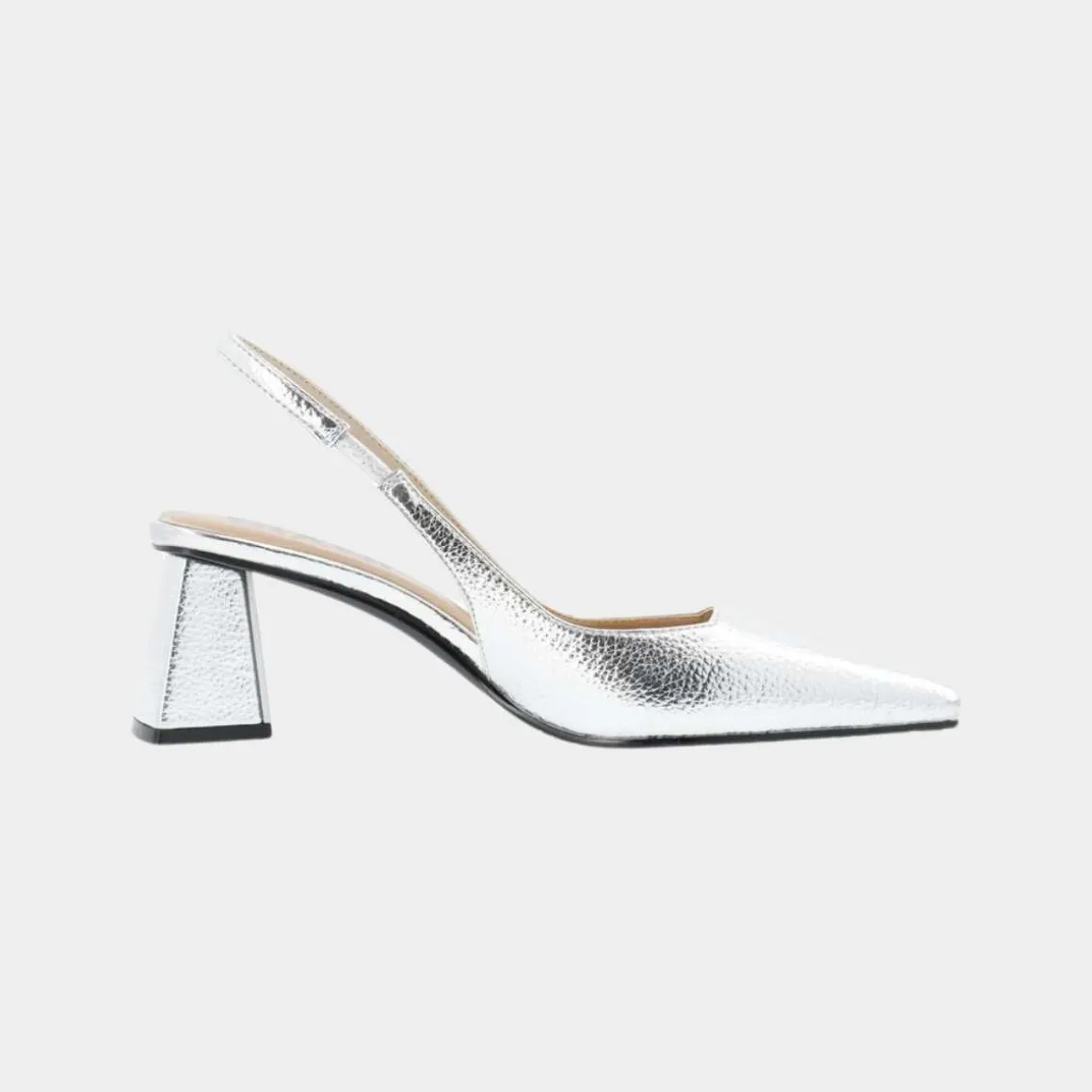 Lekker slingback i sølv fra Bianco med 6 cm hælhøyde. Overlær i patentskinn og elastiske slingback-stropper.