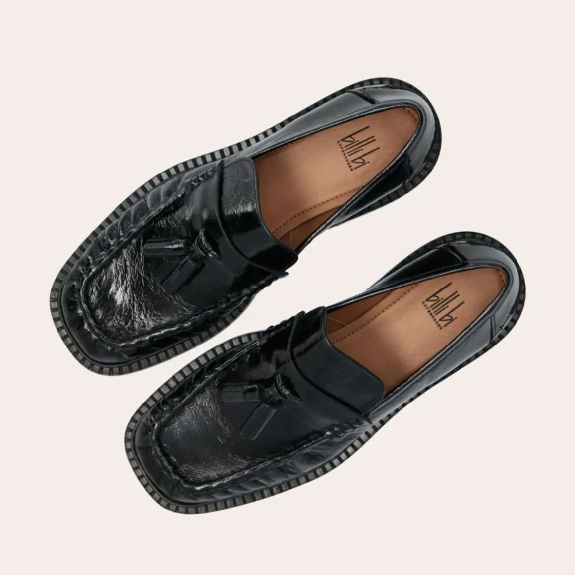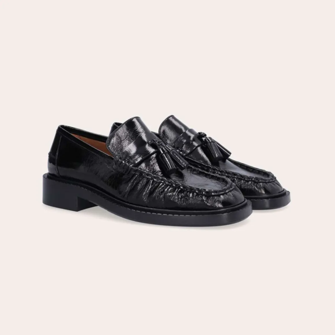 Eksklusiv damesko, laget for hånd i Portugal. Denne elegante loaferen er utført i sort lakkert skinn med firkantet tå for et moderne og stilrent uttrykk. Over vristen prydes den av en enkel stropp med to klassiske dusker, kombinert med markerte stikninger og lett rynket skinn – en detalj som fremhever den håndverksmessige kvaliteten.