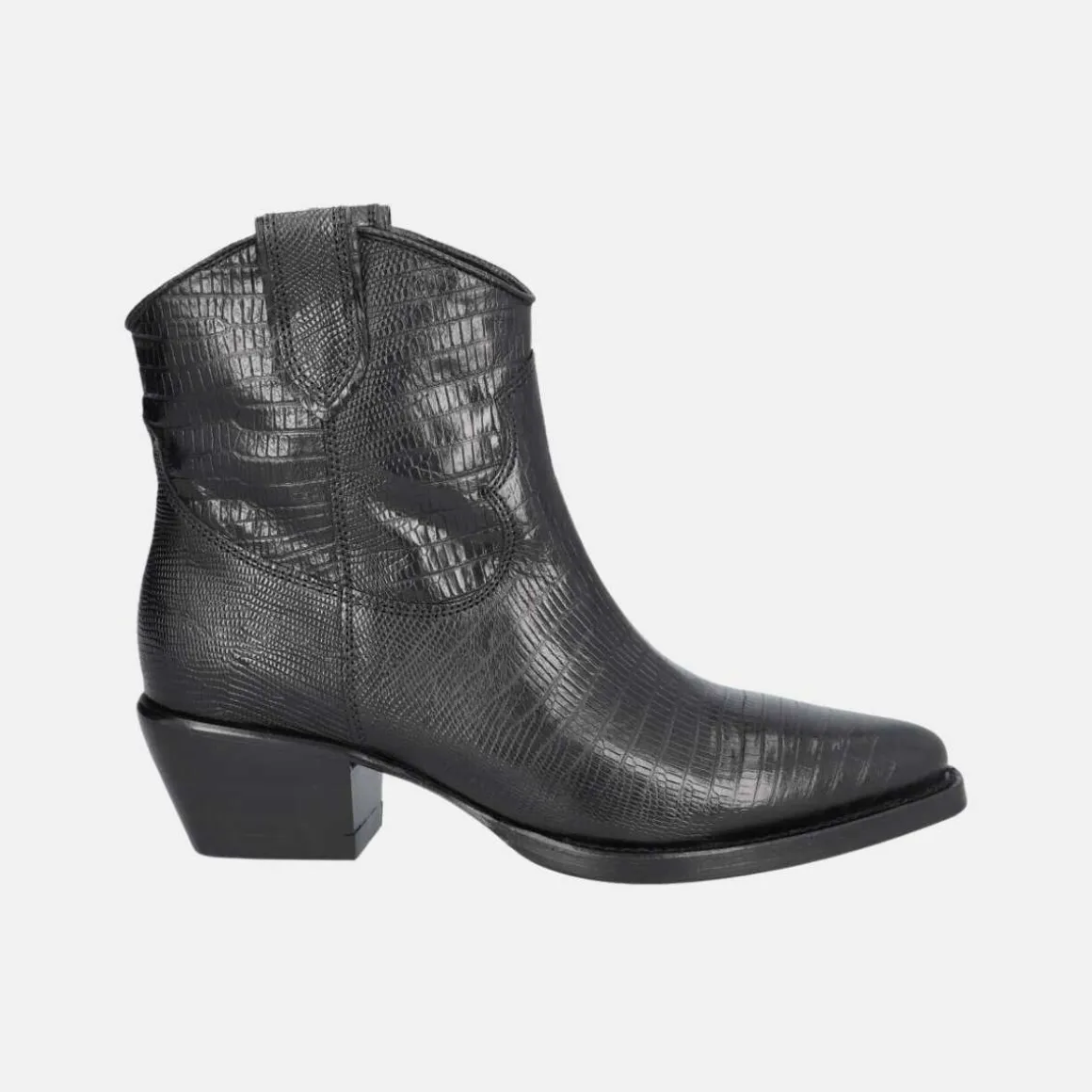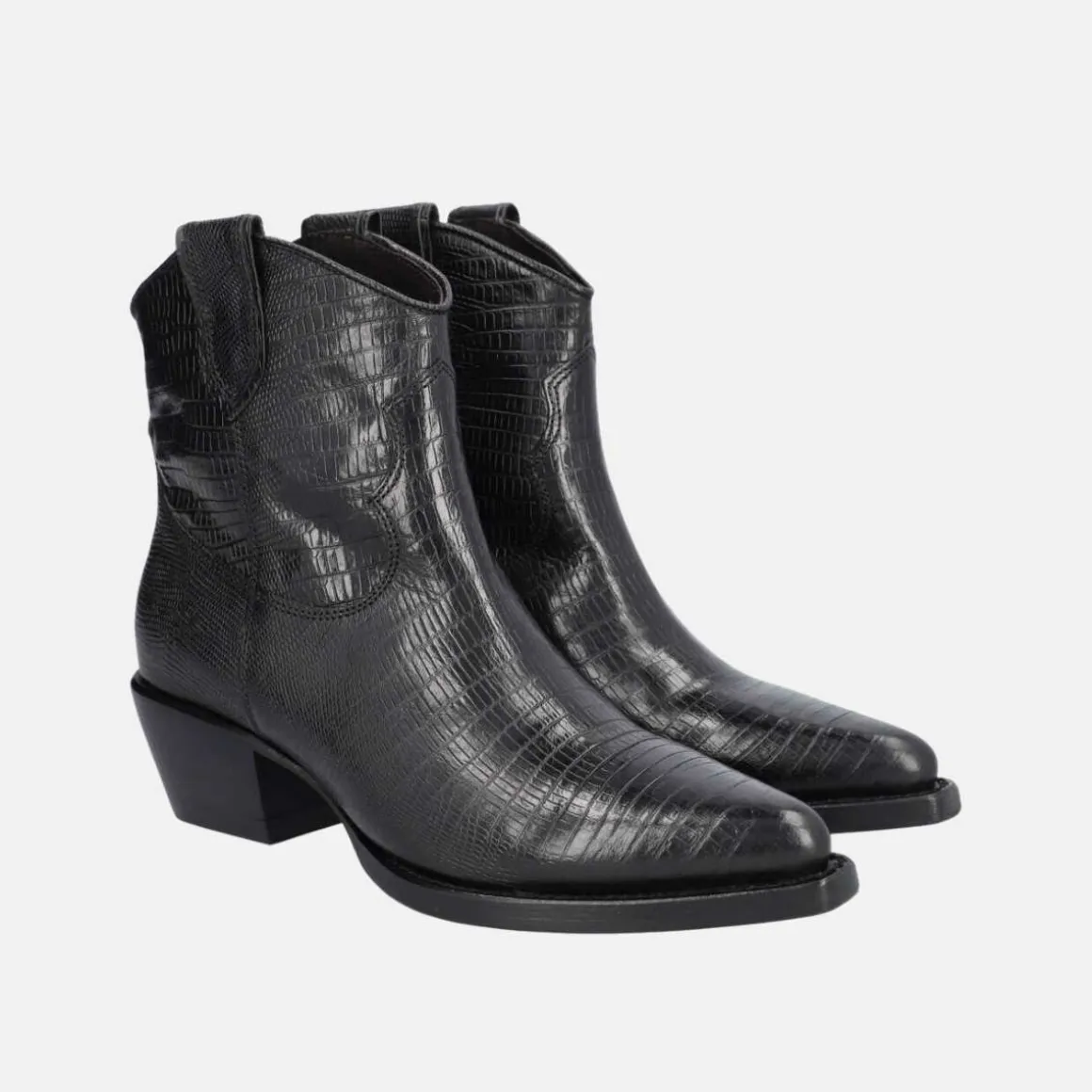 Håndlaget cowboystøvel fra Billi Bi, laget av sort glatt skinn med spiss tå. Støvelen er dekorert med en stropp på begge sider og et mønster av sting på skaftet. Fint croc-skinn som setter prikken over i-en på støvlene.